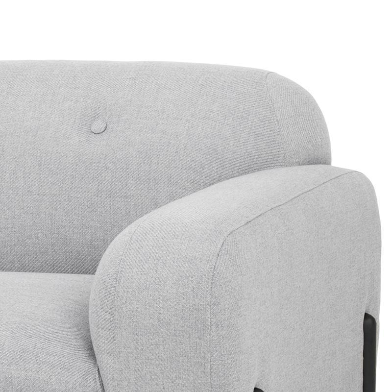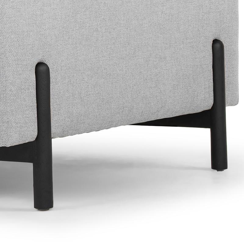- Rounded natural wood legs in black stained to balance with the textured upholstery
