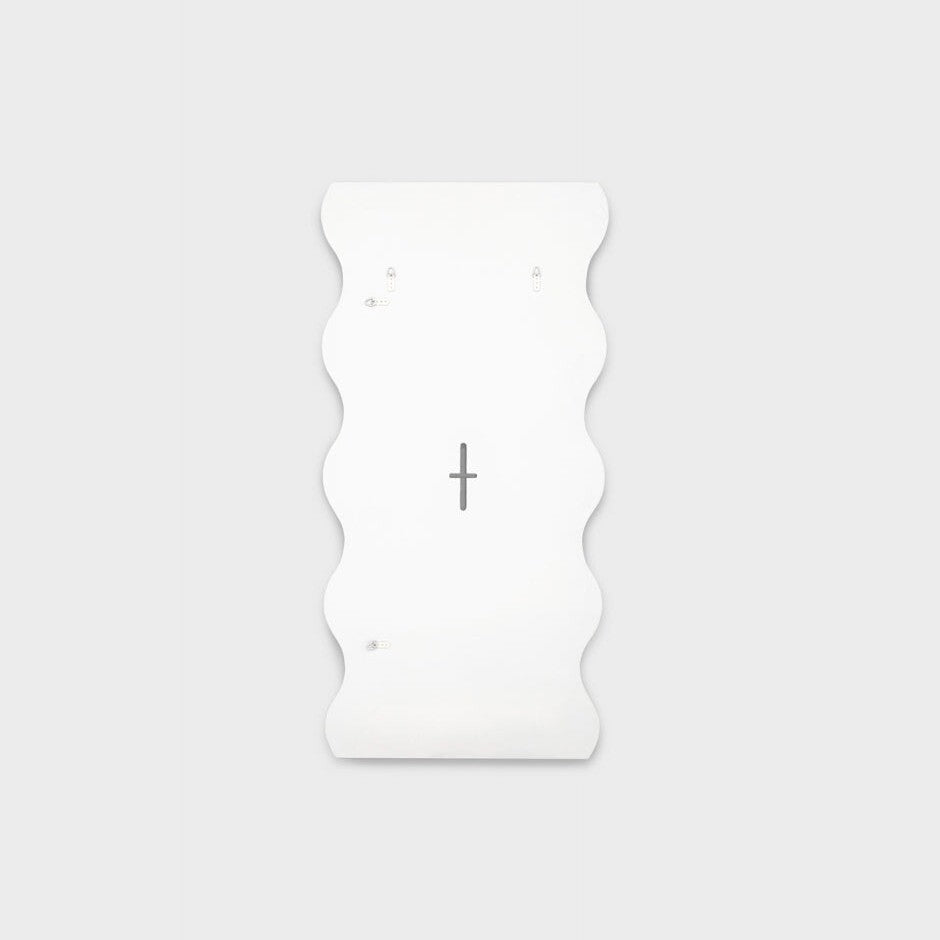 Mirrored glass, painted engineered wood frame, engineered wood backing.