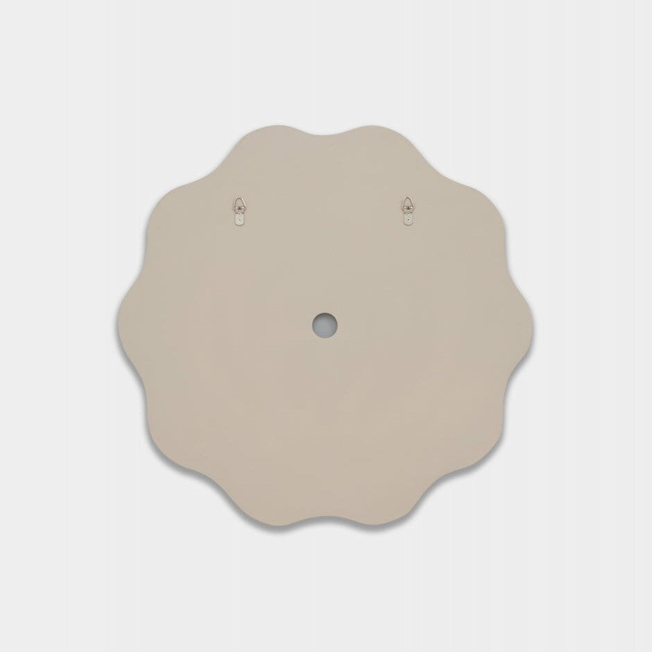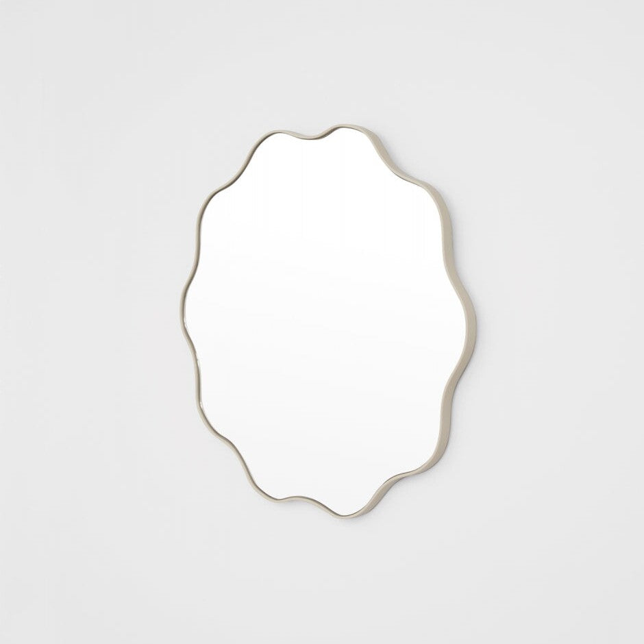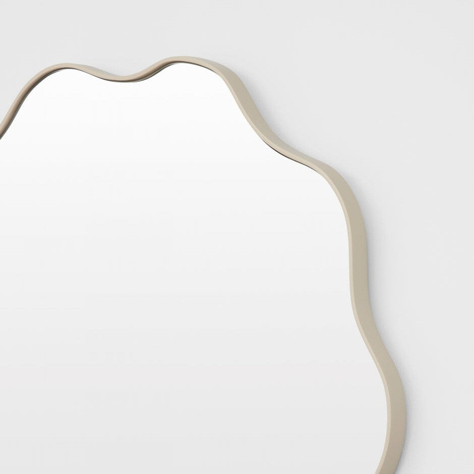 Mirrored glass, painted engineered wood frame, engineered wood backing.