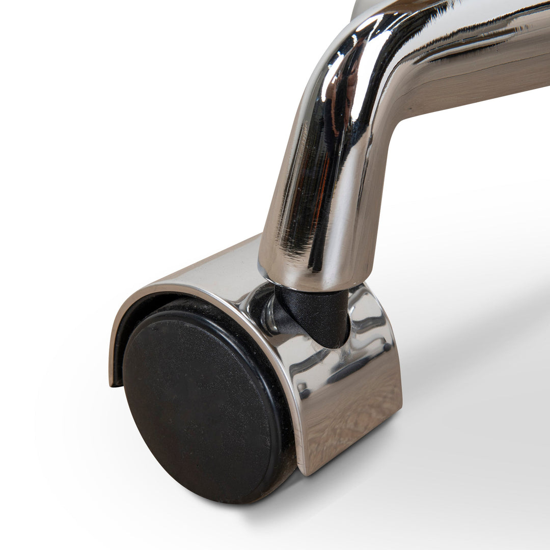 - Polished die-cast chrome aluminum frame with a set of removable chromed castors