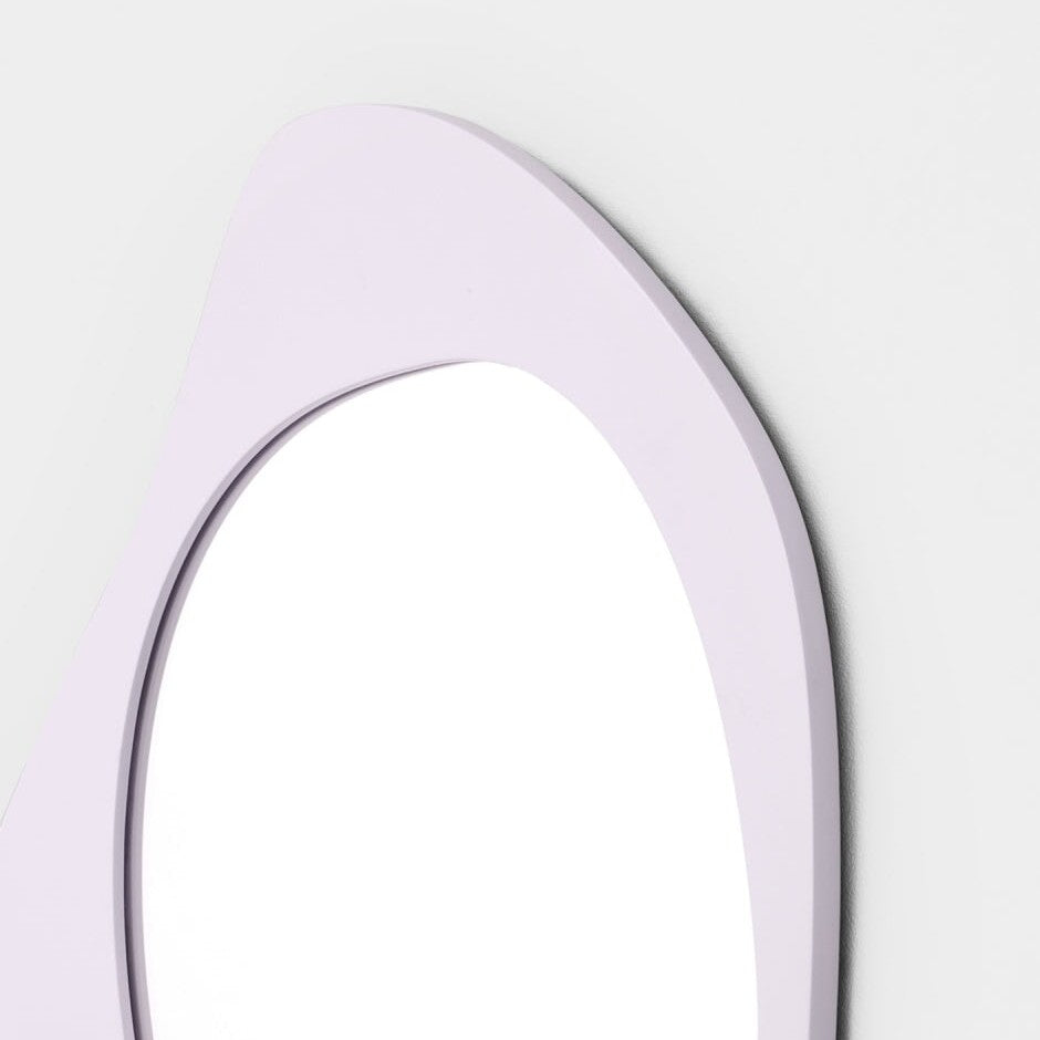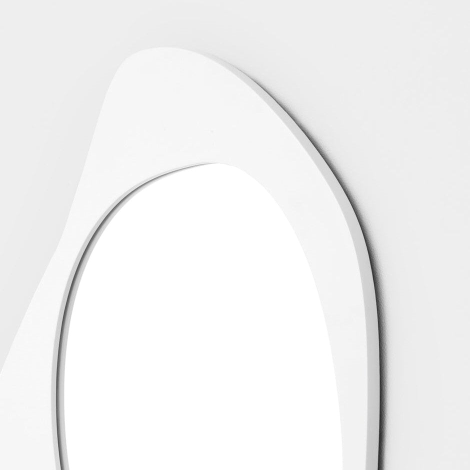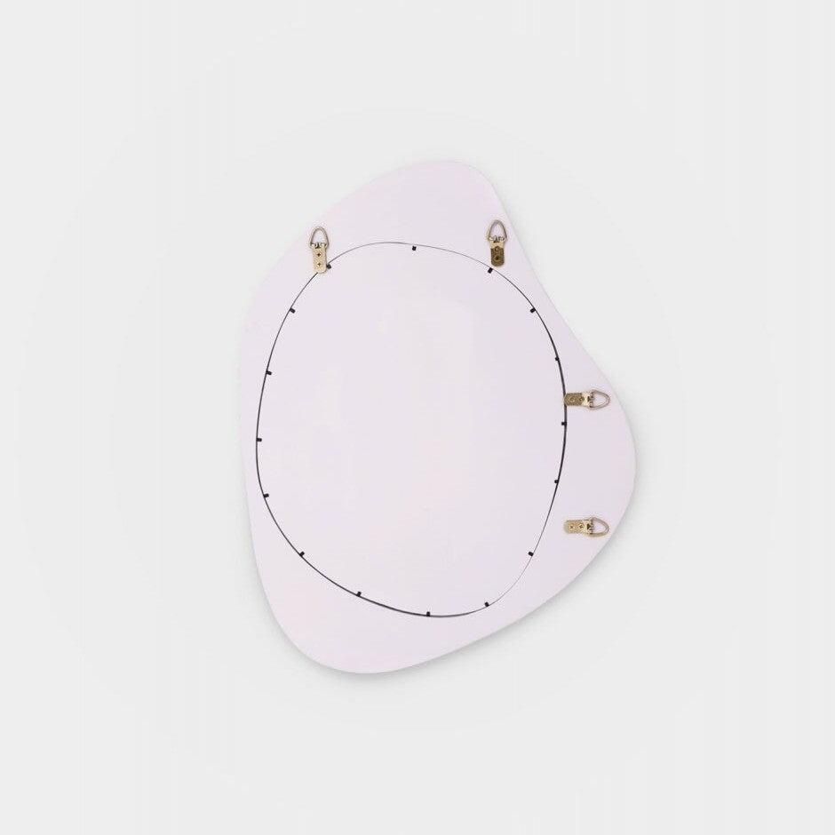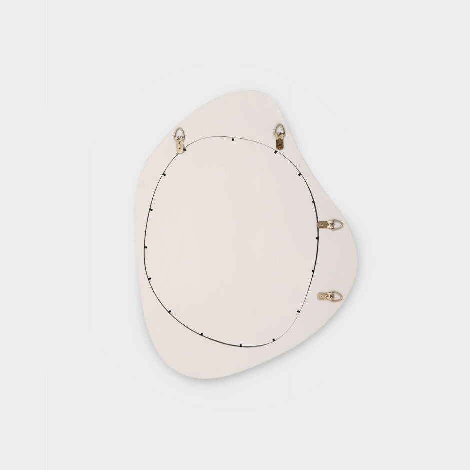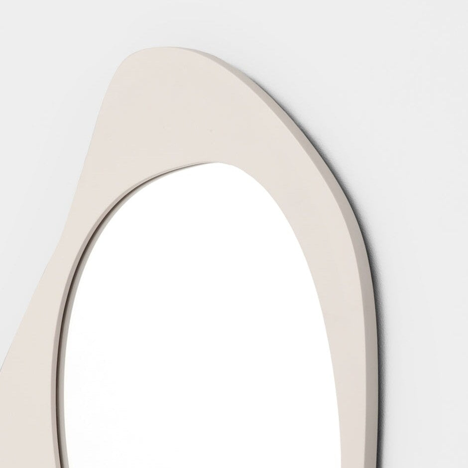 Mirrored glass, painted engineered wood frame, engineered wood backing.
