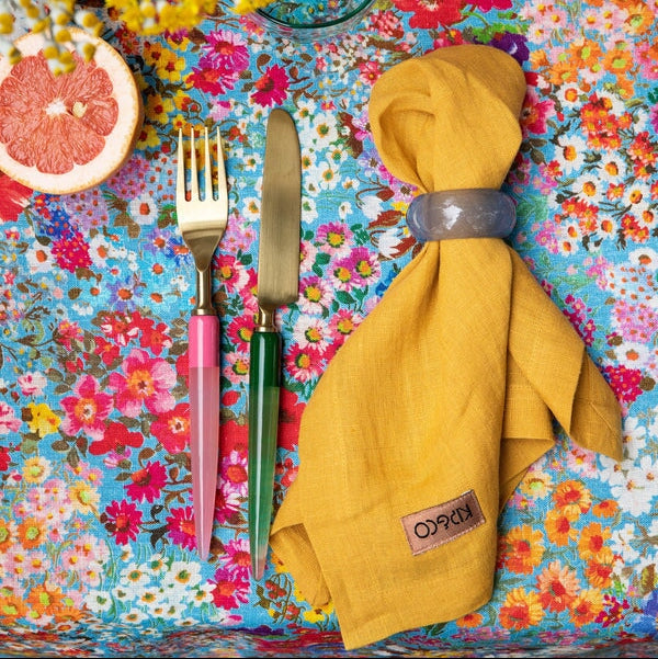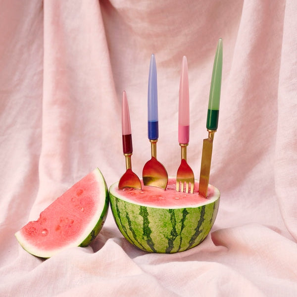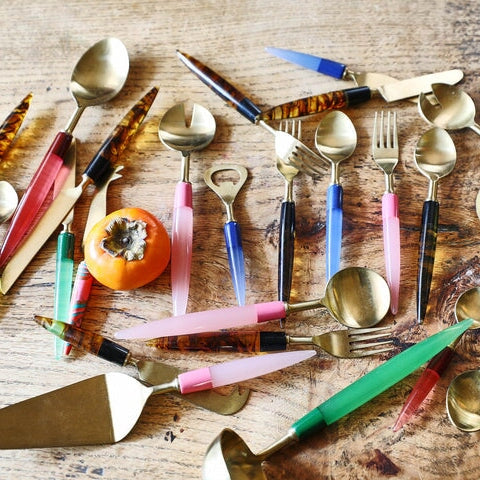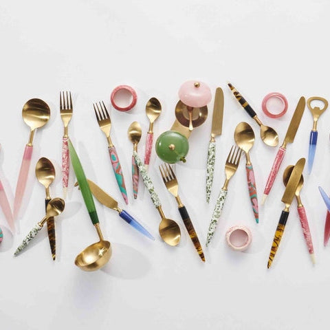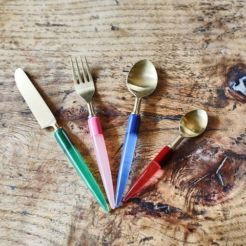 A gorgeous and lively tablescape is something to behold. Bring the beauty with our handcrafted cutlery set. An 8 piece combination set of pink, green, blue and red jewel toned resin with brass heads. Set includes 2 x forks, 2 x knives, 2 x table spoons and 2 x teaspoons.