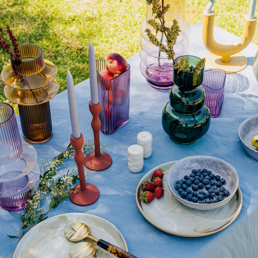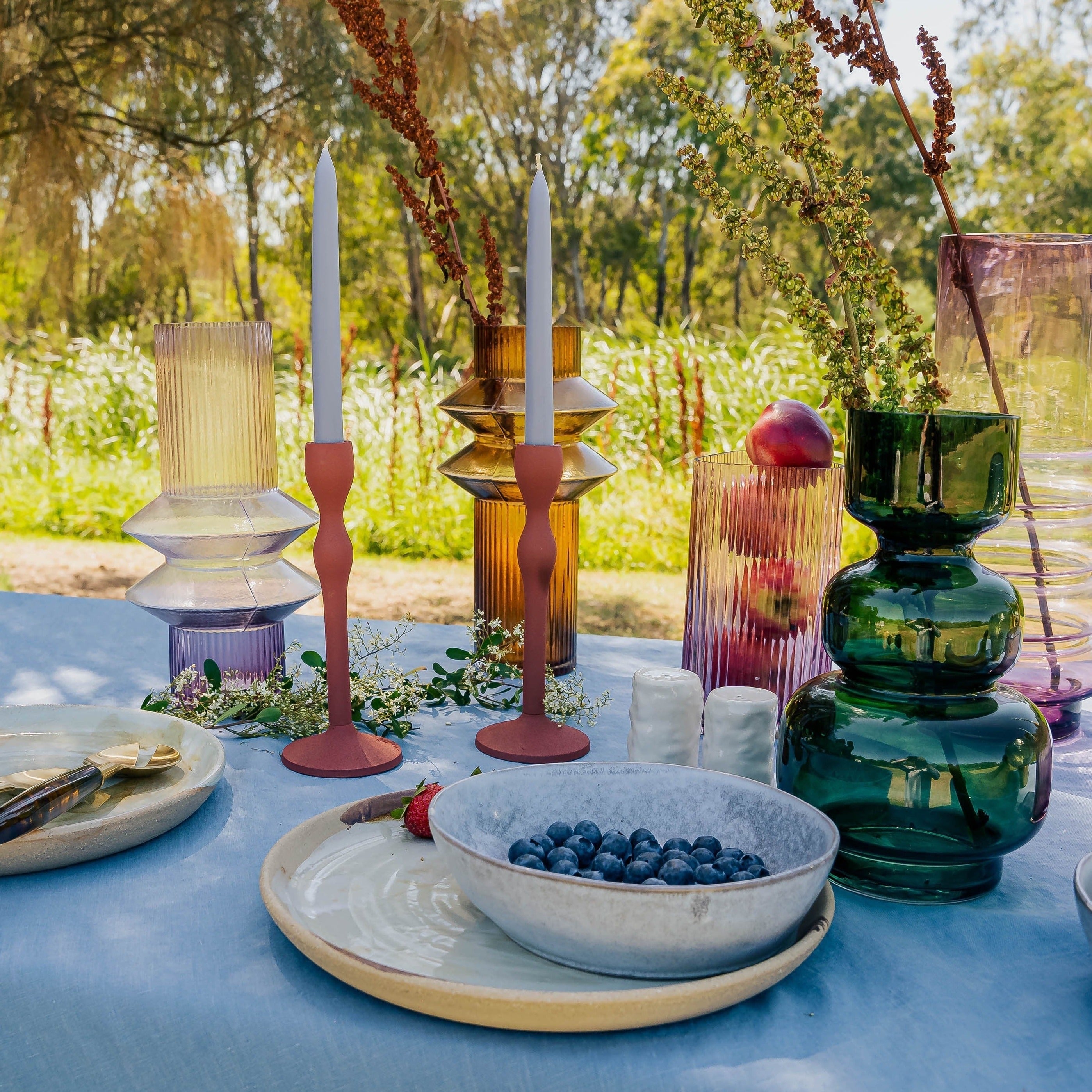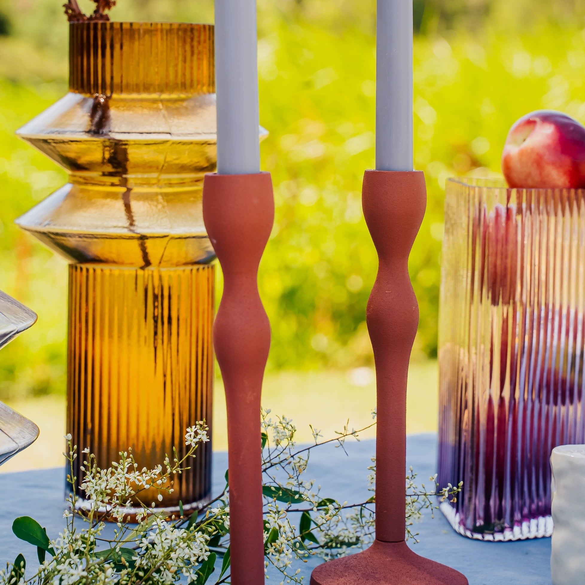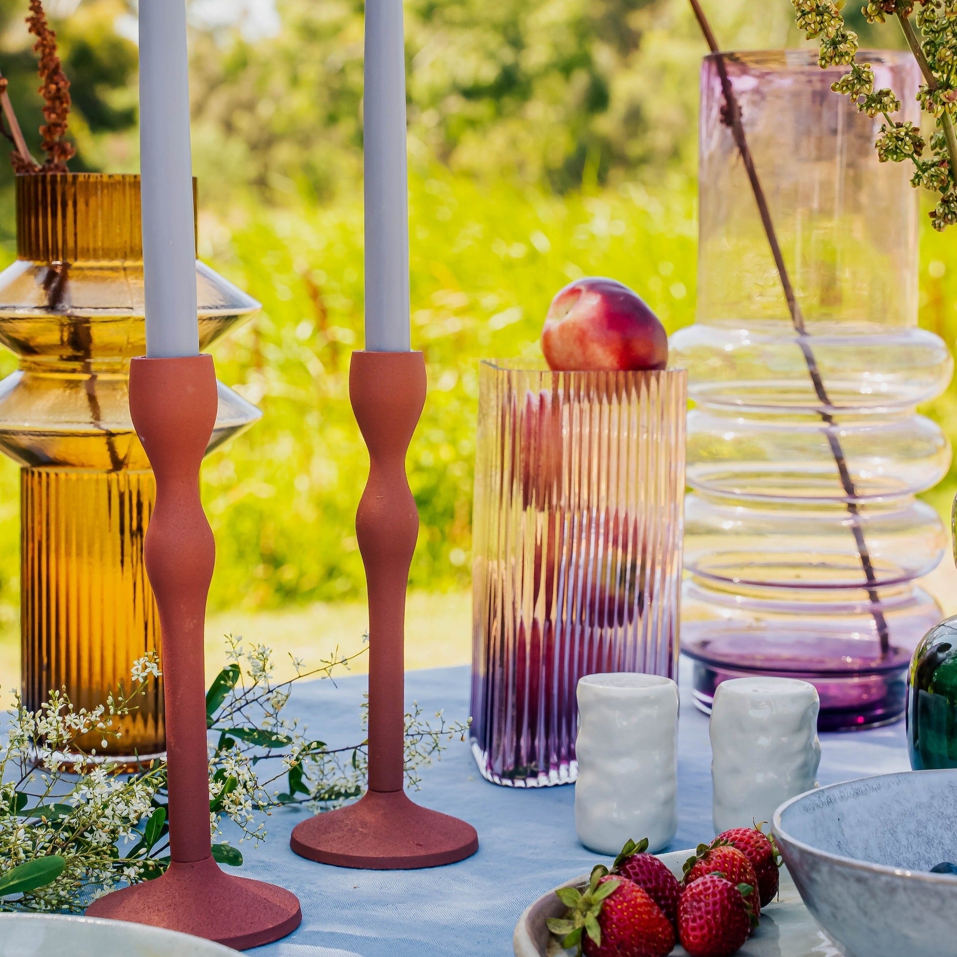 The Deena Candle Holder by Bloomingville is made of aluminium and has a warm mustard colour. The rough structure leaves a nice matte look. The choice of material, colour and shape makes an interesting contrast, that is perfect for any table, console or window sill.