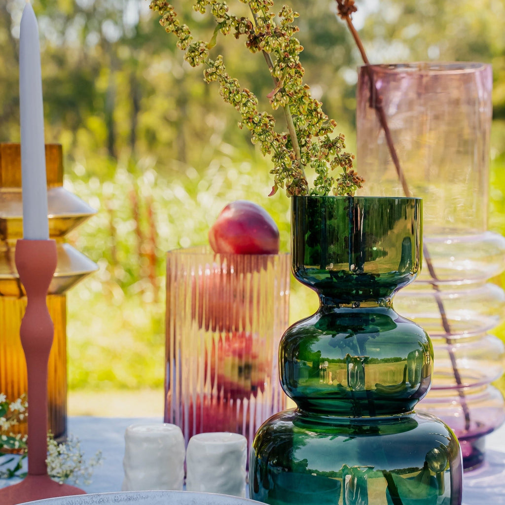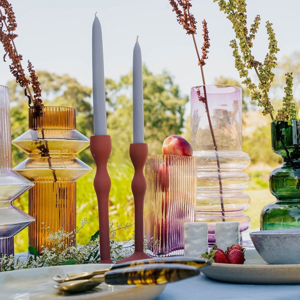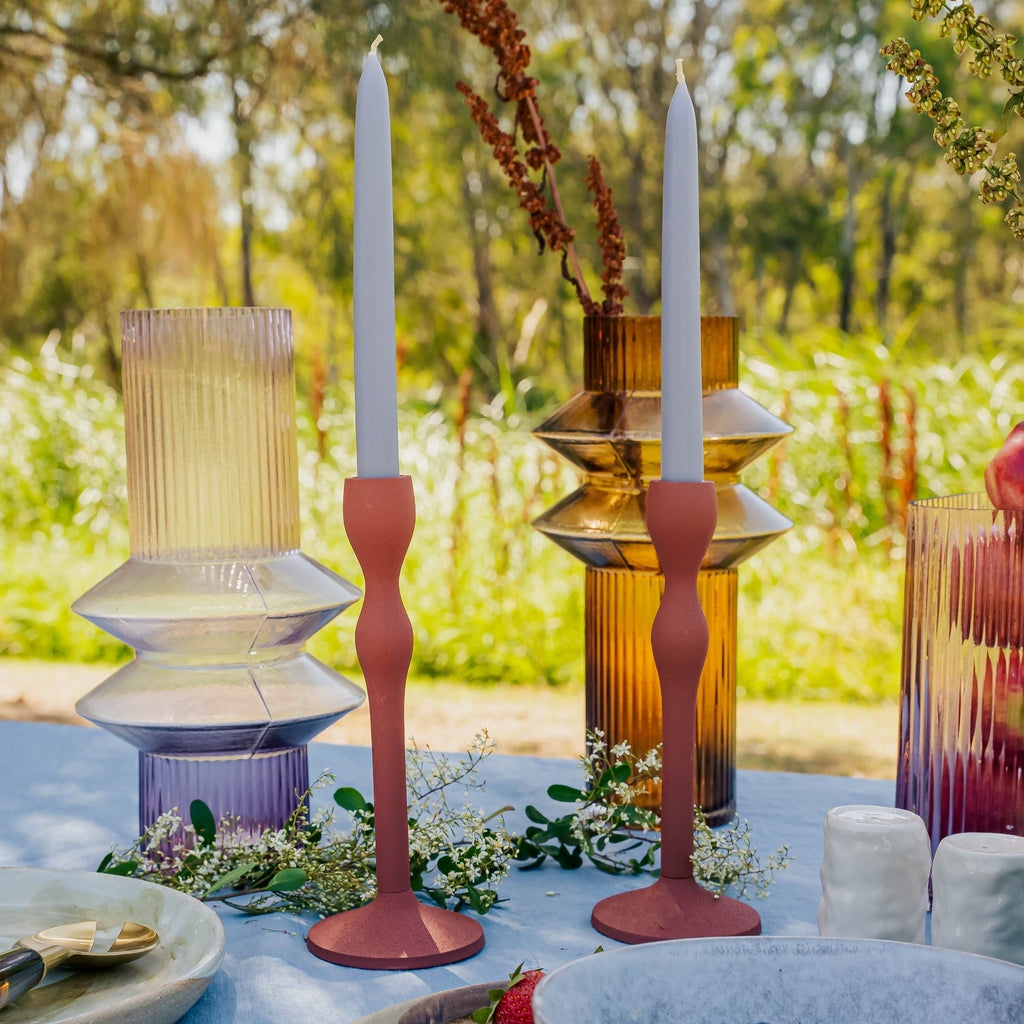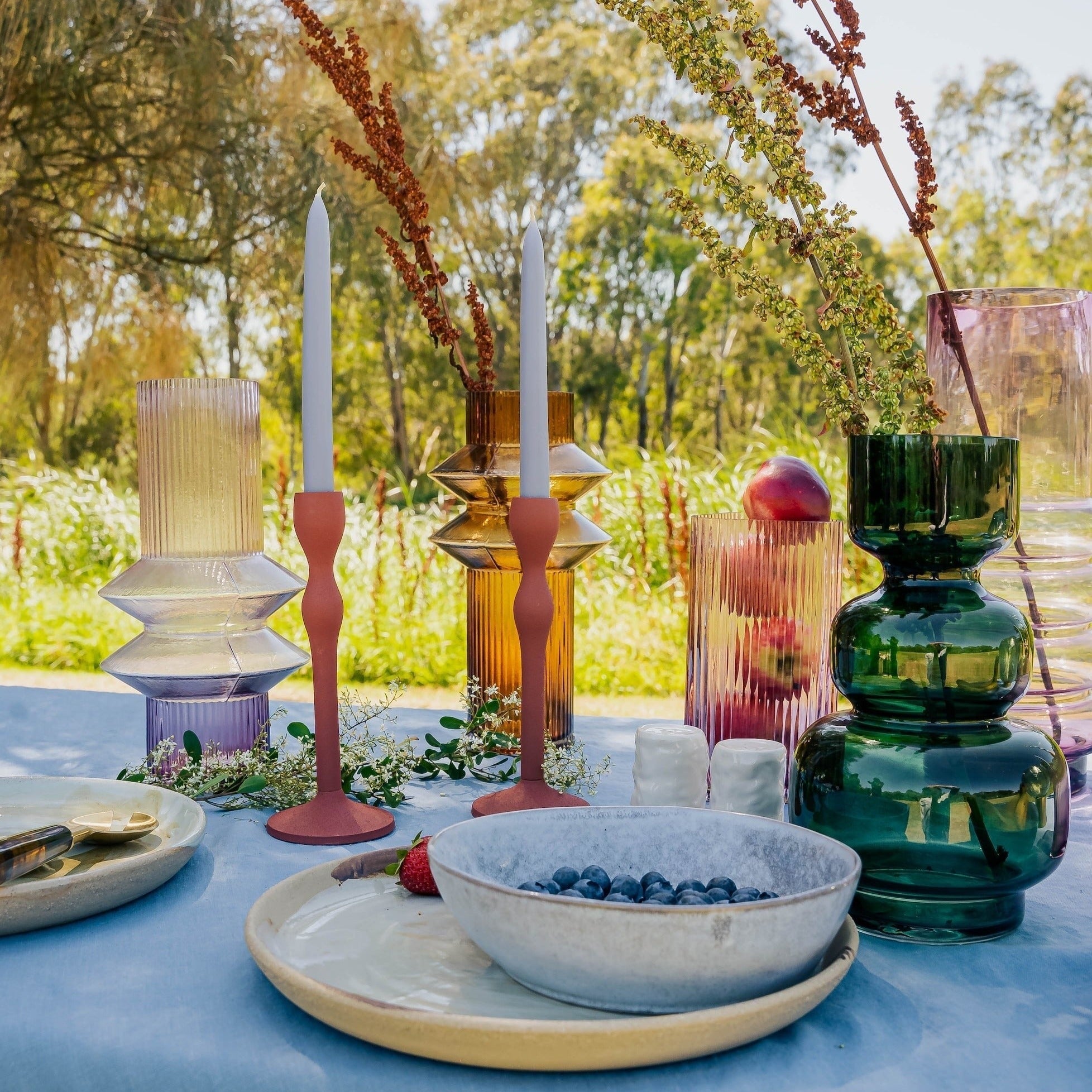 The Deena Candle Holder by Bloomingville is made of aluminium and has a warm mustard colour. The rough structure leaves a nice matte look. The choice of material, colour and shape makes an interesting contrast, that is perfect for any table, console or window sill.