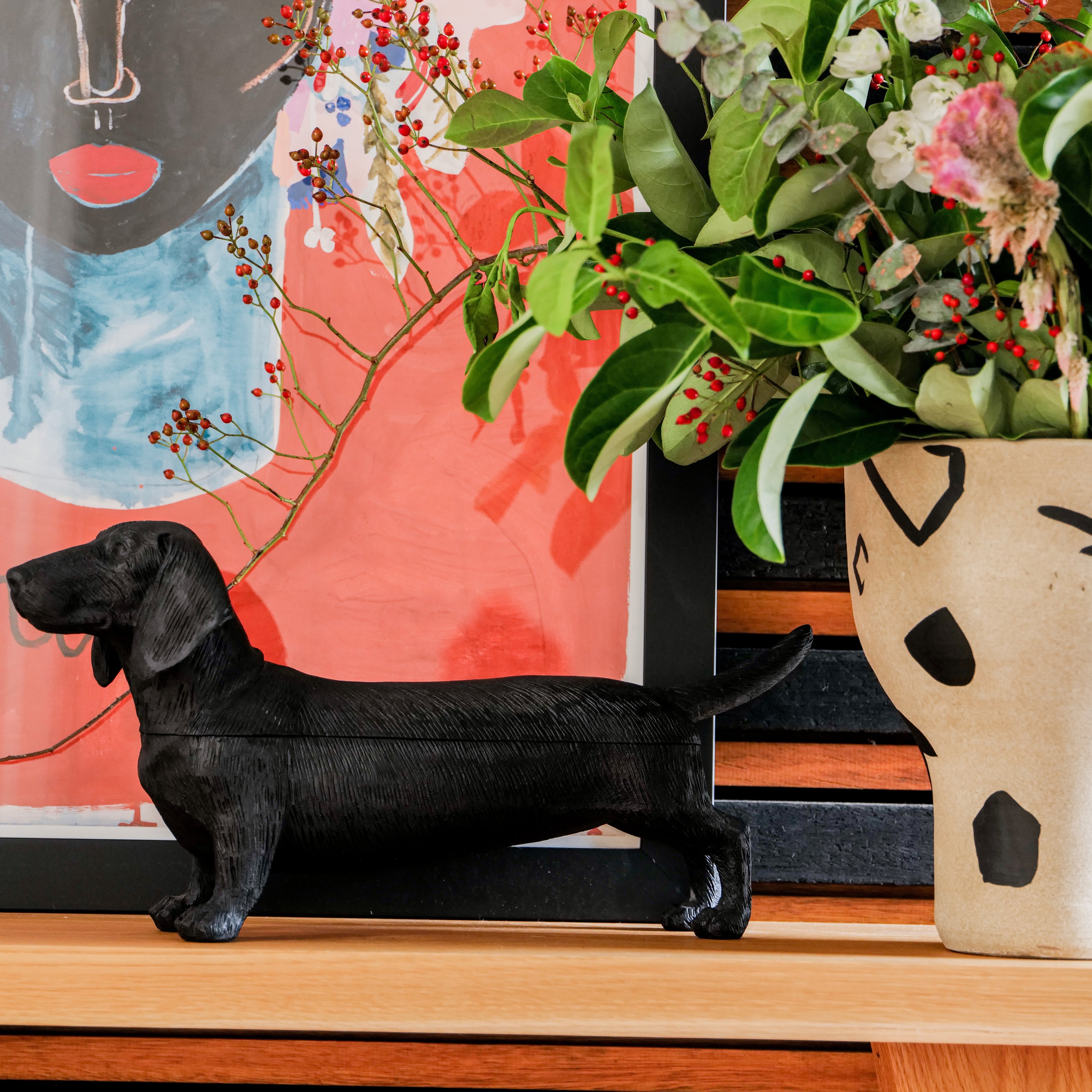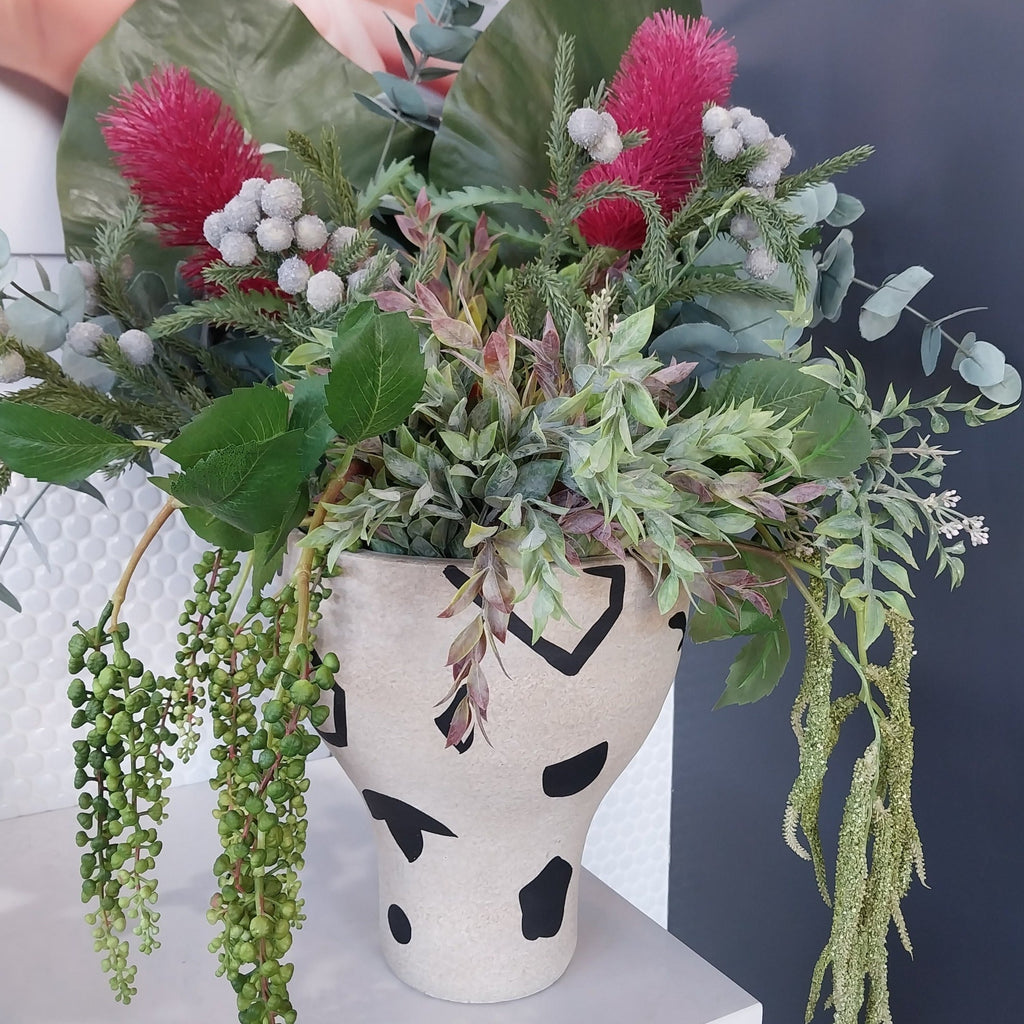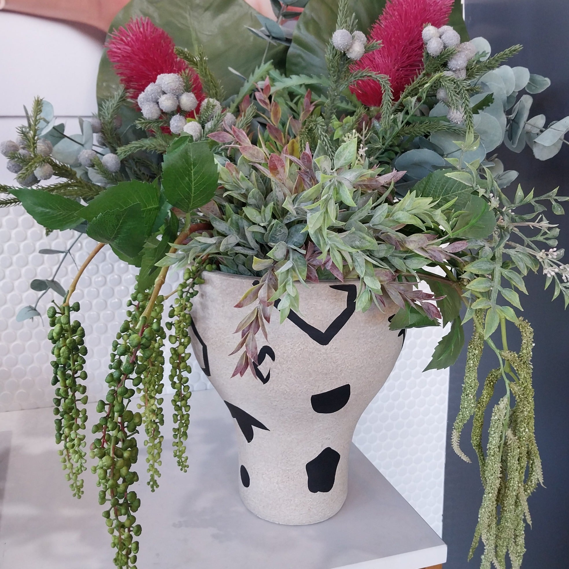 This deco vase is made of brown terracotta and in a simple, soft, cup-like shape with a wide opening at the top. In addition to the natural colour variation and texture of terracotta, this vase has been decorated with small, black, graphic paintings by hand which make every vase unique. A beautiful decoration for the table, window sill or dresser.