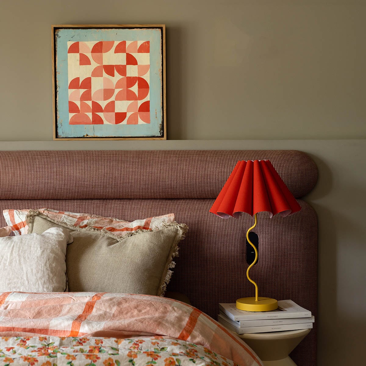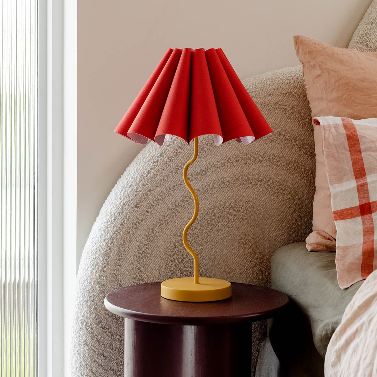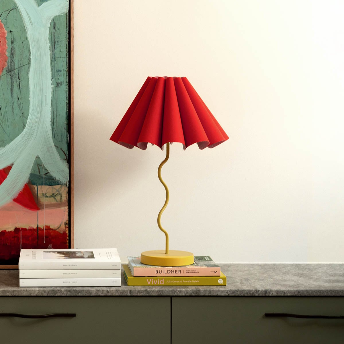 Introducing our new vintage-style lamp, the perfect addition to any home decor. With a deep red fluted lampshade and a mustard matte squiggly metal base, this lamp will add a touch of elegance to your space.