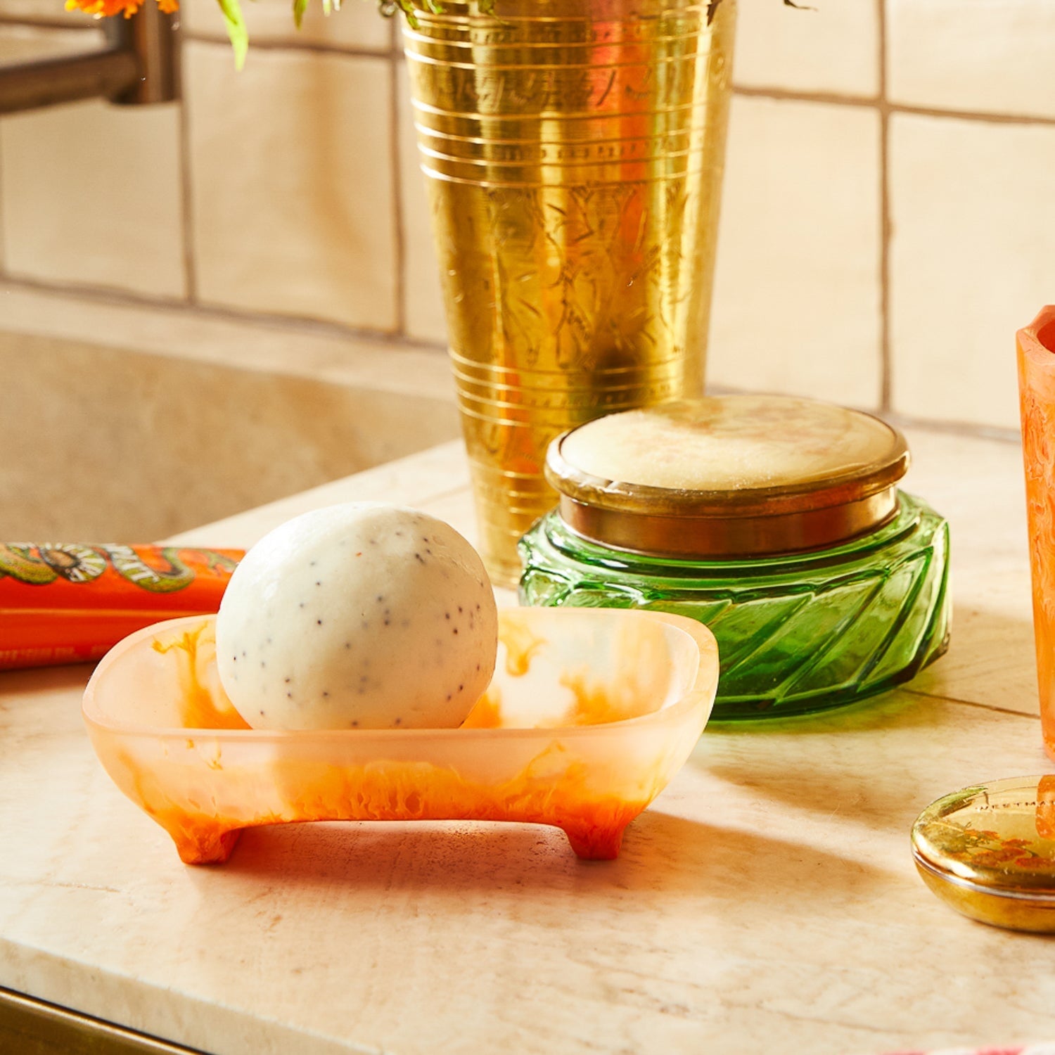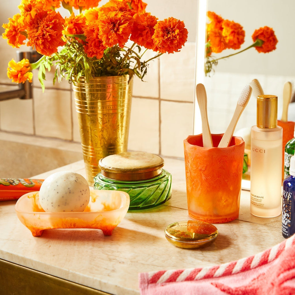 “The Daja Soap Dish is the perfect combination of style and functionality. It’s carefully designed to let your soap dry quickly and efficiently, while also being beautiful to look at. Its rounded silhouette is finished with flower-shaped drainage holes for a playful touch. Reimagined here in our stunning Persimmon colourway – swirling together a rich orange and transparent resin for a bright statement.” – Phoebe’s Style Notes