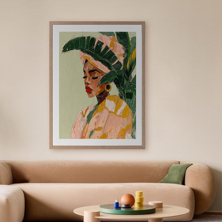 Espléndida Framed Art Print - Meaning 'gorgeous' in Spanish, this romantic Mexican-inspired artwork is a stunning rendition of a woman in traditional clothing, her red lipstick a statement on its own. Textured brush strokes and palette knife marks add to the depth and life of the piece, with vibrant shades of pink, mustard yellow, and light and dark green.
