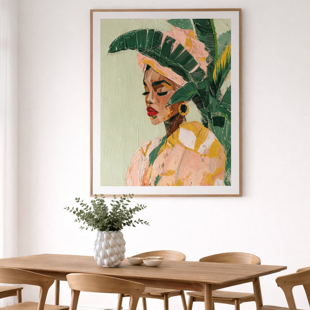 Espléndida Framed Art Print - Meaning 'gorgeous' in Spanish, this romantic Mexican-inspired artwork is a stunning rendition of a woman in traditional clothing, her red lipstick a statement on its own. Textured brush strokes and palette knife marks add to the depth and life of the piece, with vibrant shades of pink, mustard yellow, and light and dark green.