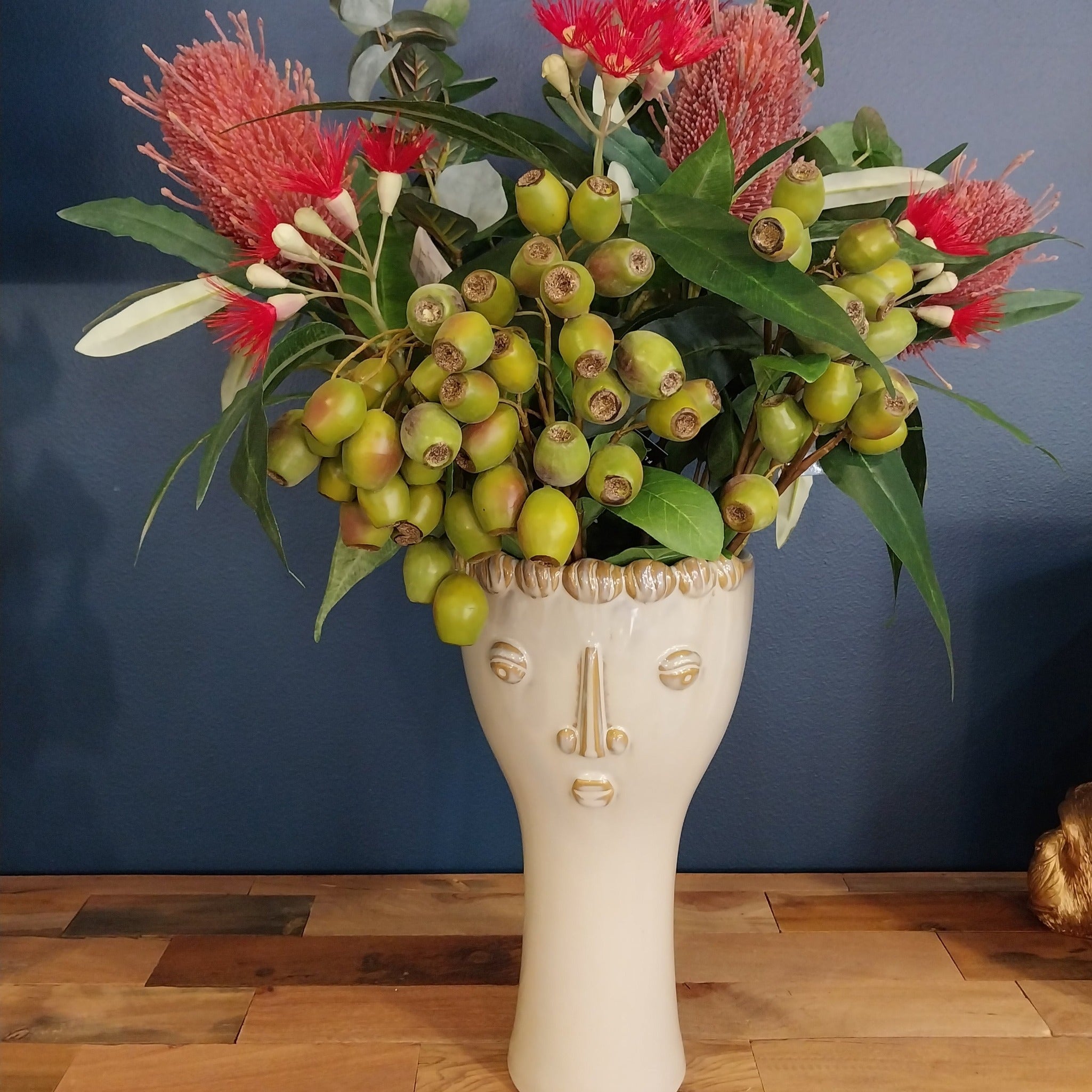 The artificial natives and in particular this eucalyptus gum nut in the VAVOOM's range are amazingly life-like. The fine details and colours are amazing, so true to life that it is difficult to note the difference. The faux eucalyptus gum nut can easily be styled with other artificial stems from our extensive range of natives. You can enjoy long lasting beauty with these faux stems with minimal maintenance be sure to keep out of direct sunlight.