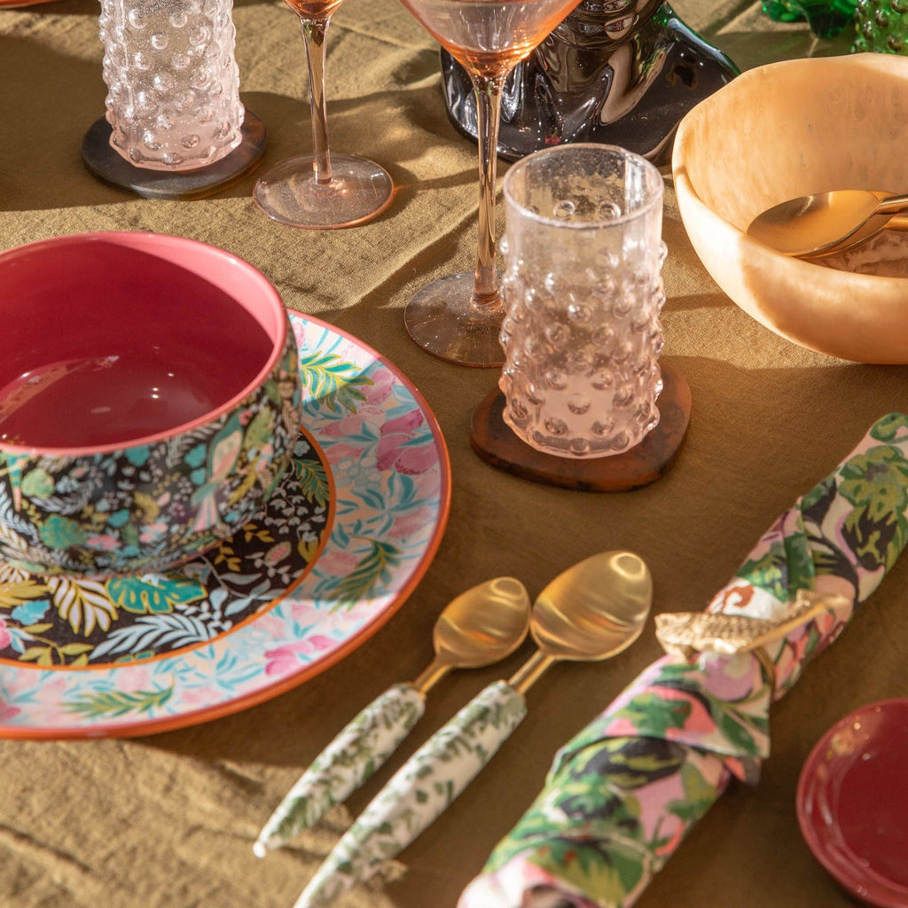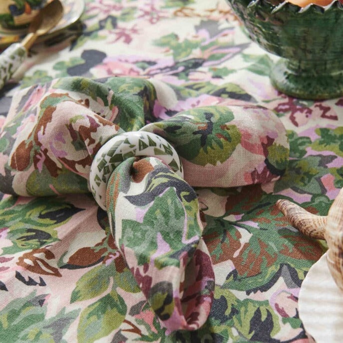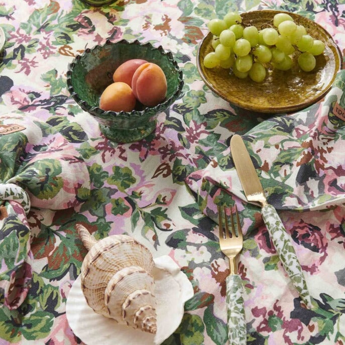 Add some zest to your kitchen and dining space with our range of fabulous feature tableware and napery! A napkin set may be the finishing touch to your table scape. Wild roses and overgrown greenery all over pink based print.