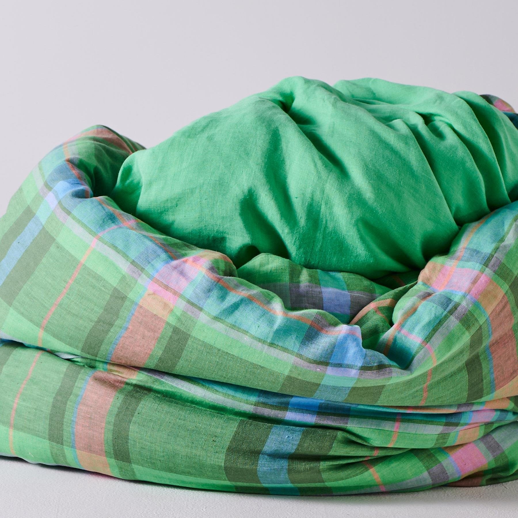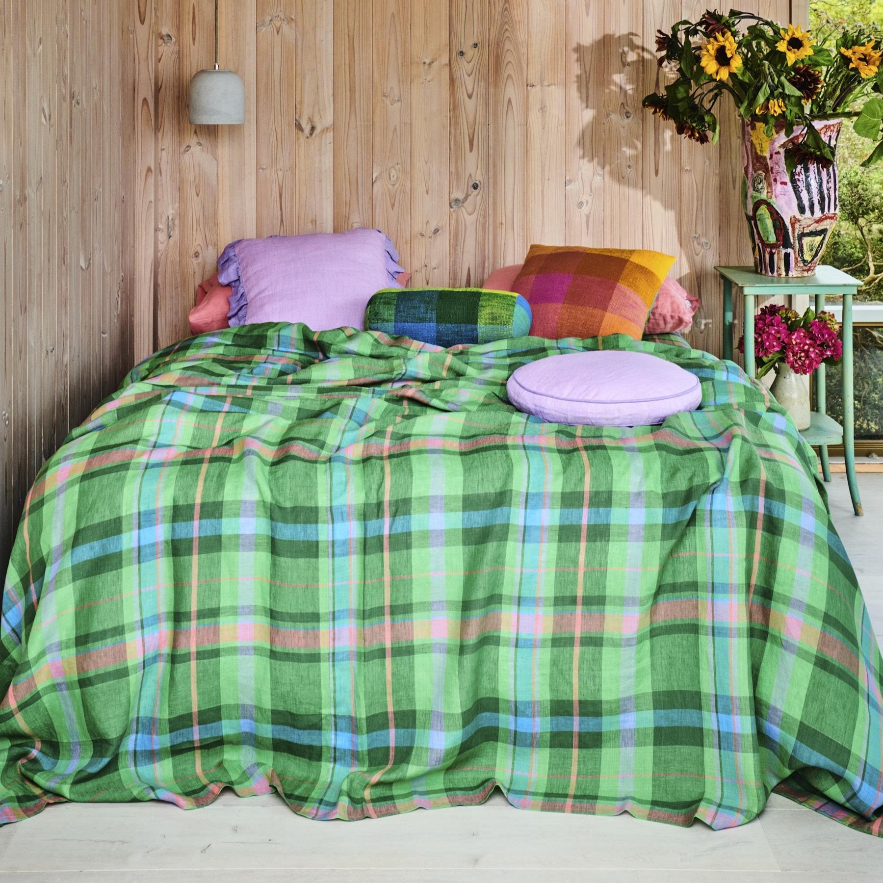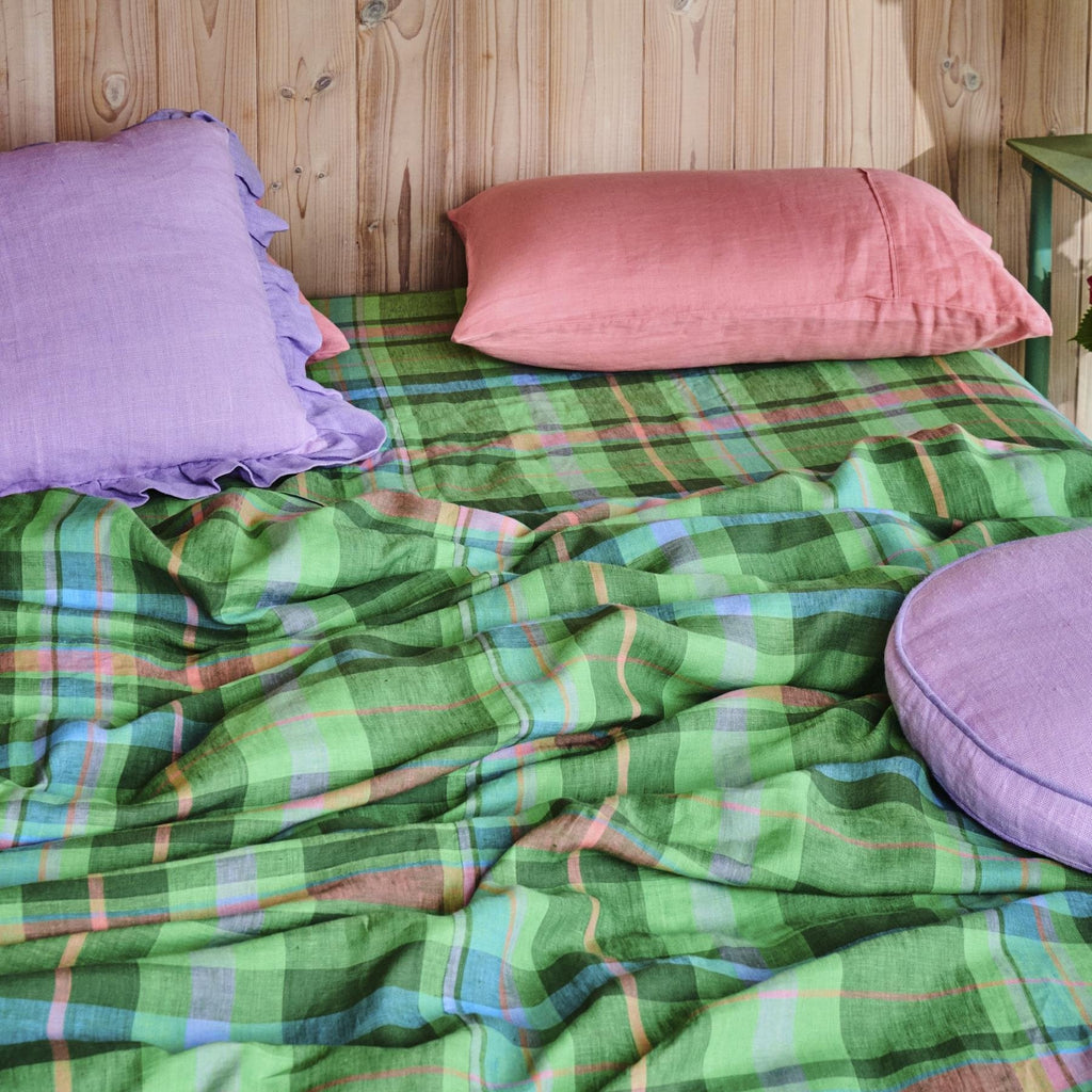 Get lost in the luxe of our sumptuous linen bedding, with buttery soft woven styles that will envelope you in luscious comfort and texture. The Jewel Of The Nile Tartan Linen Quilt Cover feaures a classic Kip&Co tartan pattern, refreshed for the summer ahead featuring jewel green tones with a mix of blue, pink and purple with plain green linen reverse. Pair with matching Jewel Of The Nile Tartan Linen Pillowcases or mix and play with texture, print and colour and build a bed worth dreaming about.