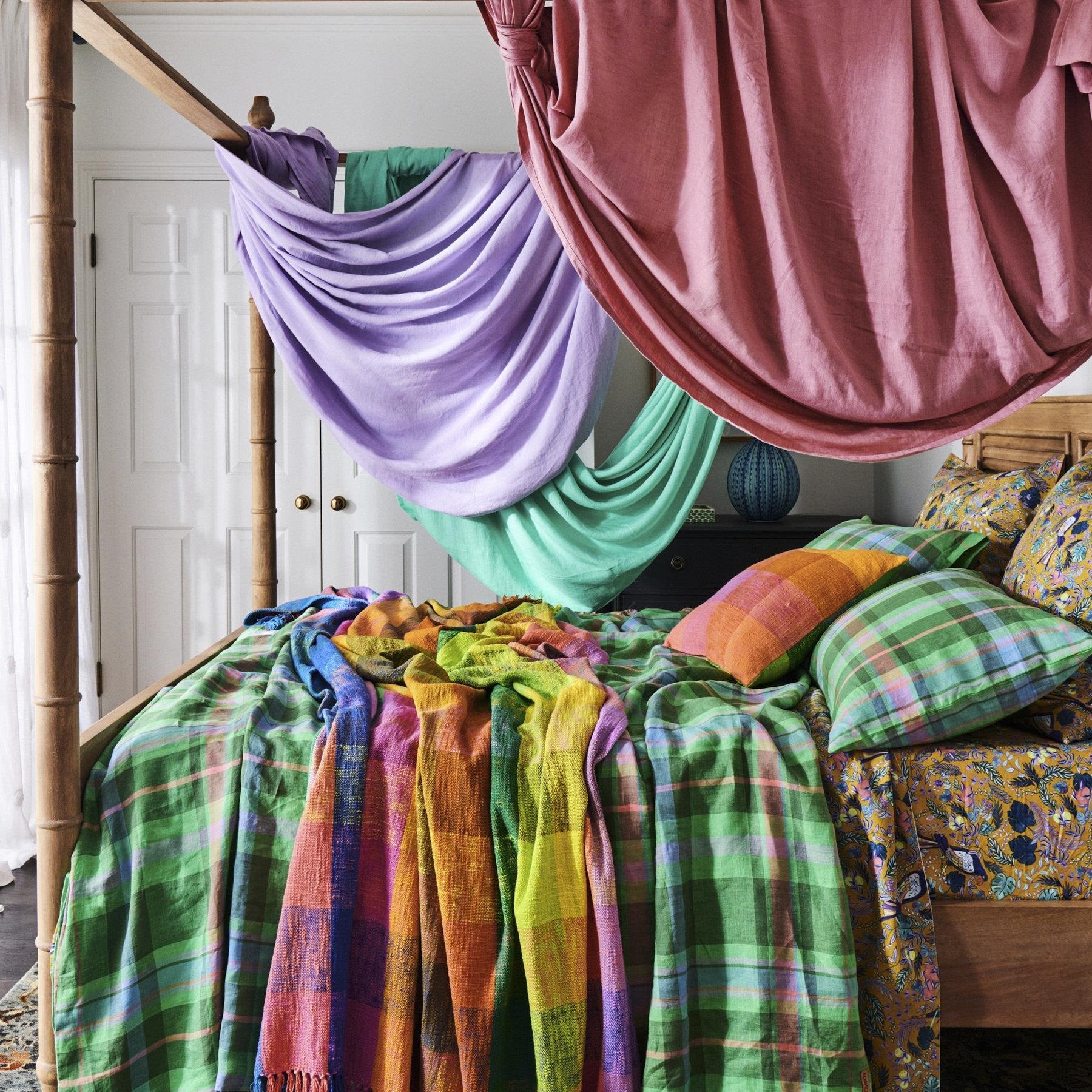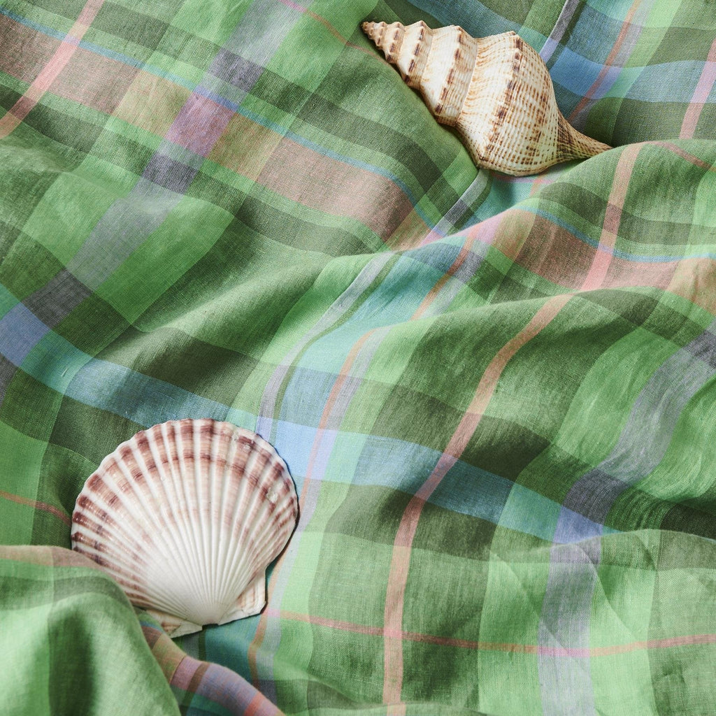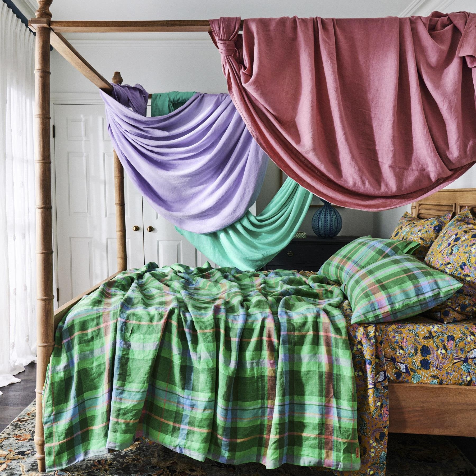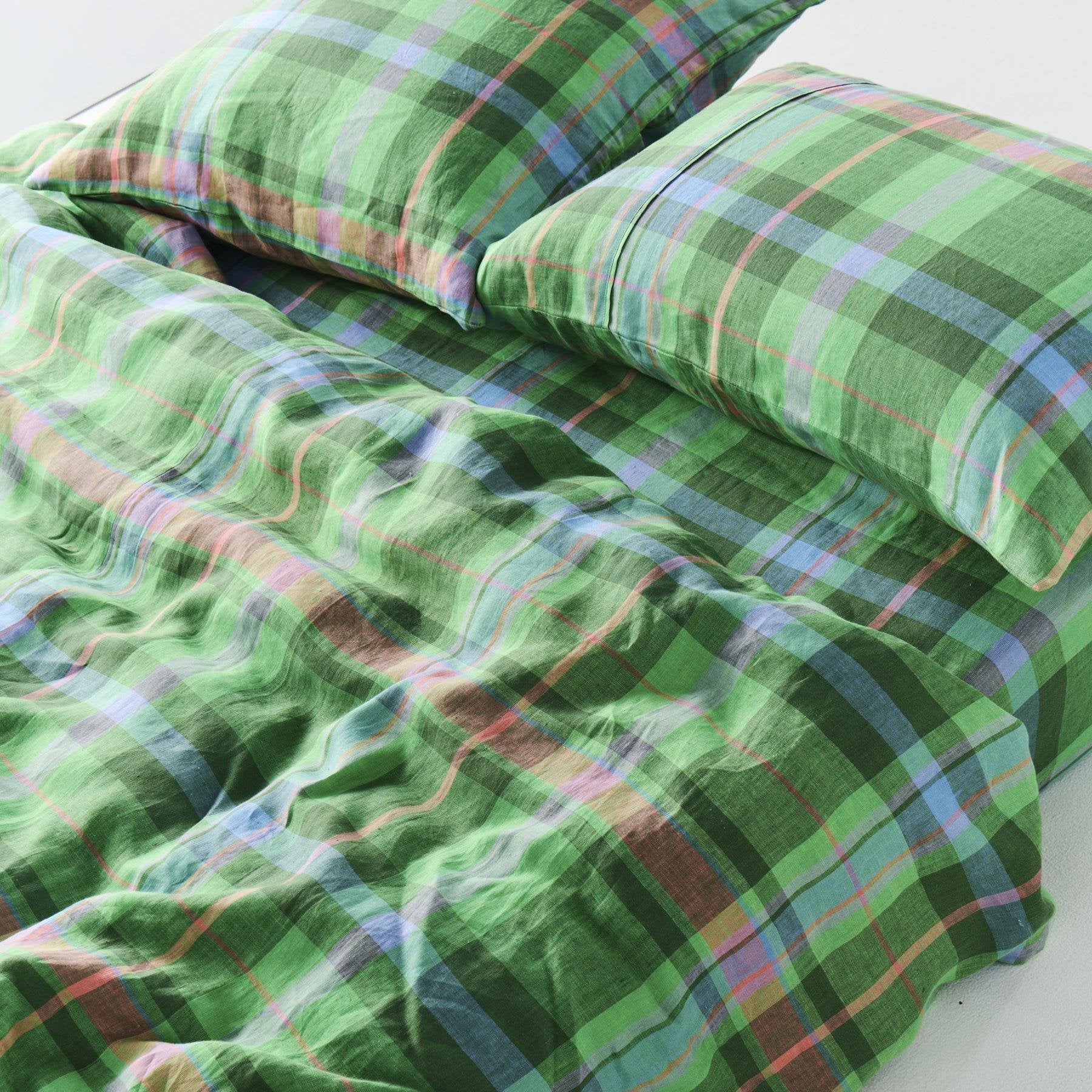 Get lost in the luxe of our sumptuous linen bedding, with buttery soft woven styles that will envelope you in luscious comfort and texture. The Jewel Of The Nile Tartan Linen Quilt Cover feaures a classic Kip&Co tartan pattern, refreshed for the summer ahead featuring jewel green tones with a mix of blue, pink and purple with plain green linen reverse. Pair with matching Jewel Of The Nile Tartan Linen Pillowcases or mix and play with texture, print and colour and build a bed worth dreaming about.