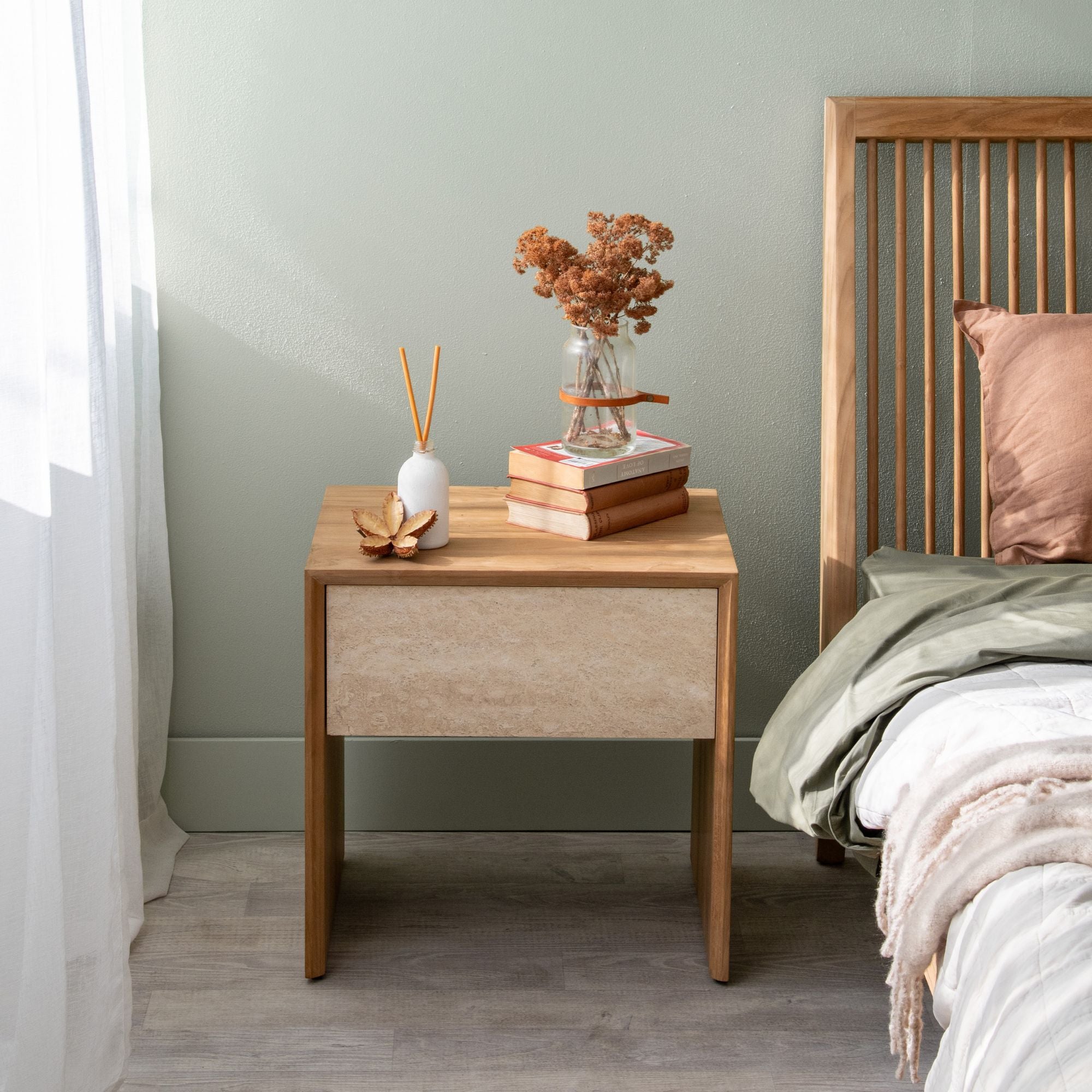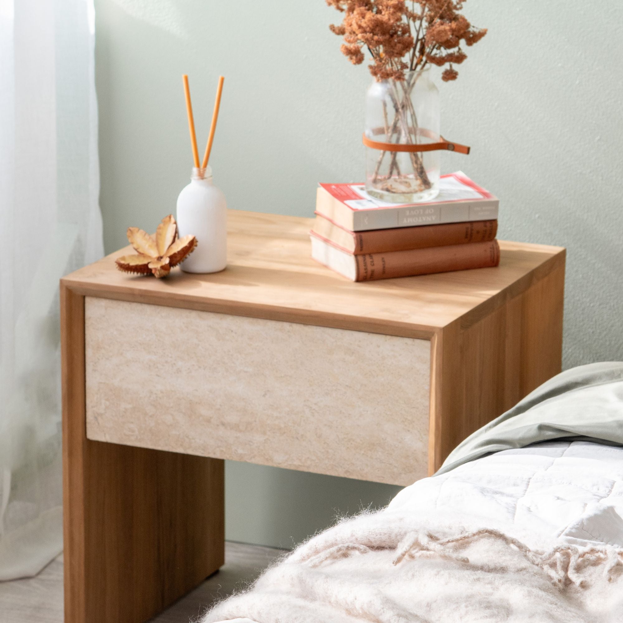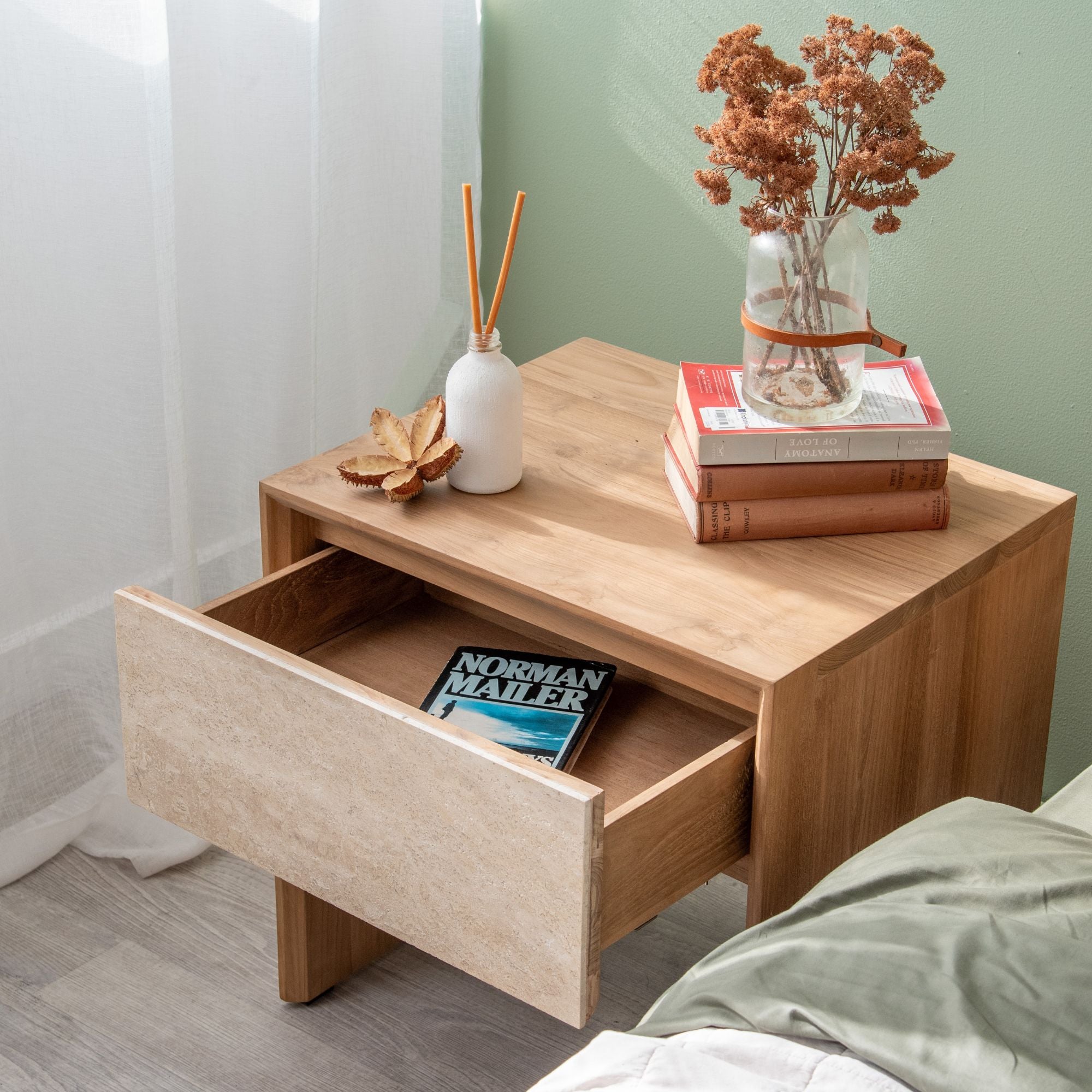 The Jodoh Marble bedside is made from sustainable teak and Statuario Bianco Marble feature for the bedside drawer. The mixture of beautiful teak wood grain and the bold grey and dark grey veins set in a crisp white background make a perfect combination and statement. The drawer is on runners with a soft close mechanism.
