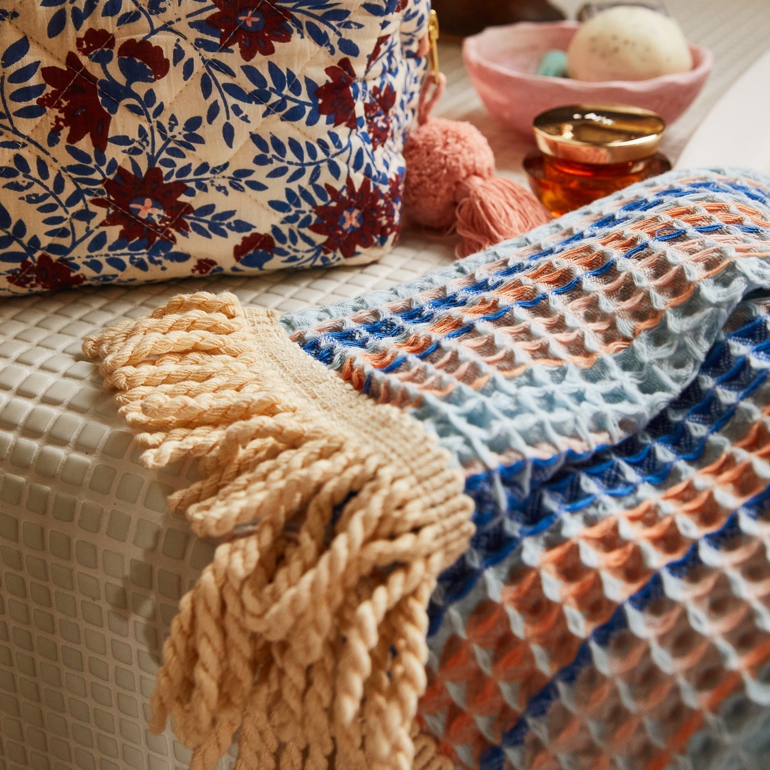 "Our Kanti hand towel takes inspiration from spice tones and stunning shades of blue. The colours capture the moodiness of dusk nights and the soft pink hues of sunset in a nostalgic striped design". – Phoebe’s Style Notes