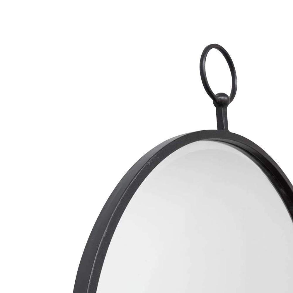 Traditional style round mirror with hanging ring.