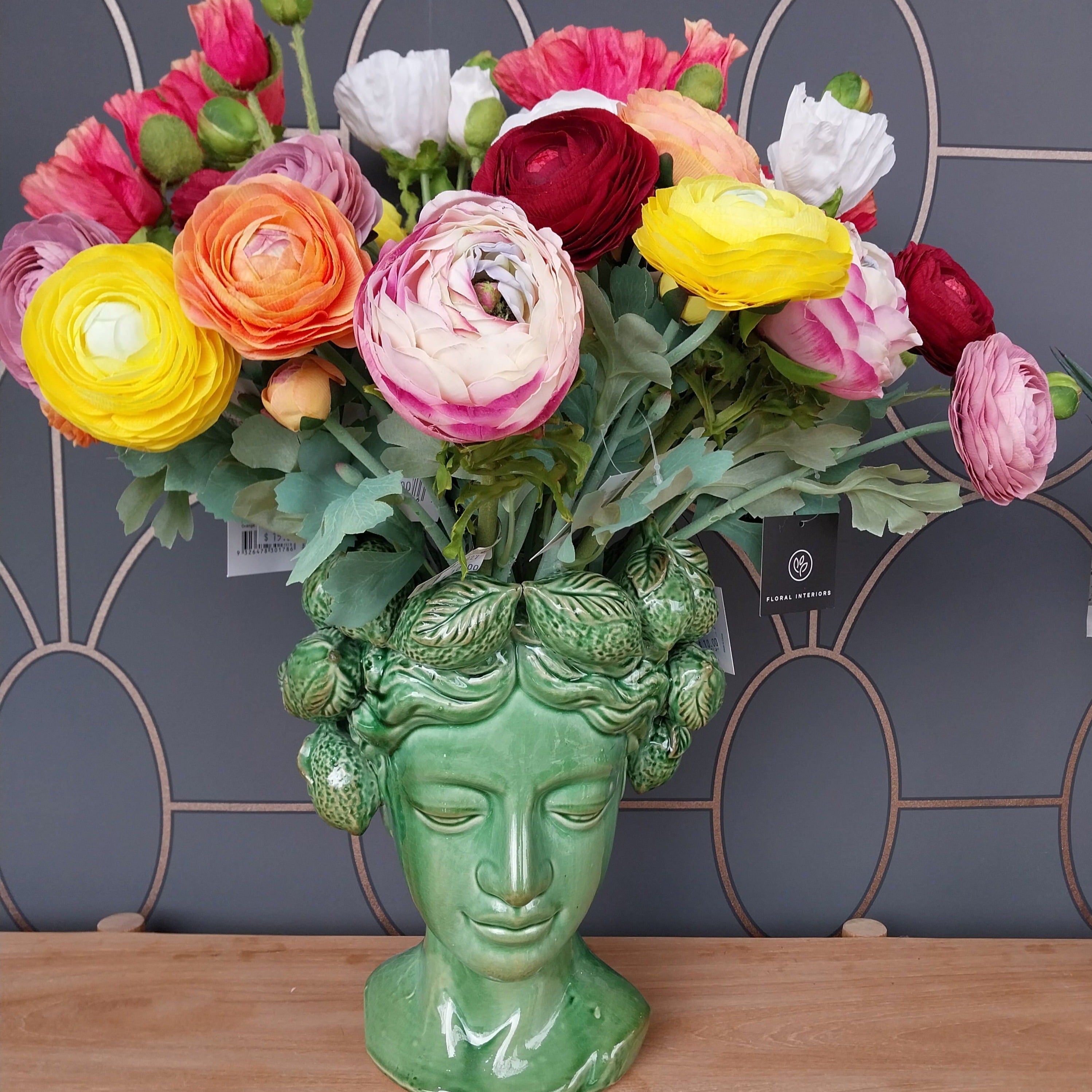 Brighten up your interior space with this stunning faux ranunculus spray, unbelievably realistic with their fresh touch you wouldn’t even think they’re faux! Style this artificial ranunculus spray simply in a beautiful bunch on their own or create an arrangement from VAVOOM's huge variety of artificial flowers. Being artificial, this ranunculus in orange is easy to care for and style in your interior space. Keep out of direct sunlight for long lasting beauty.