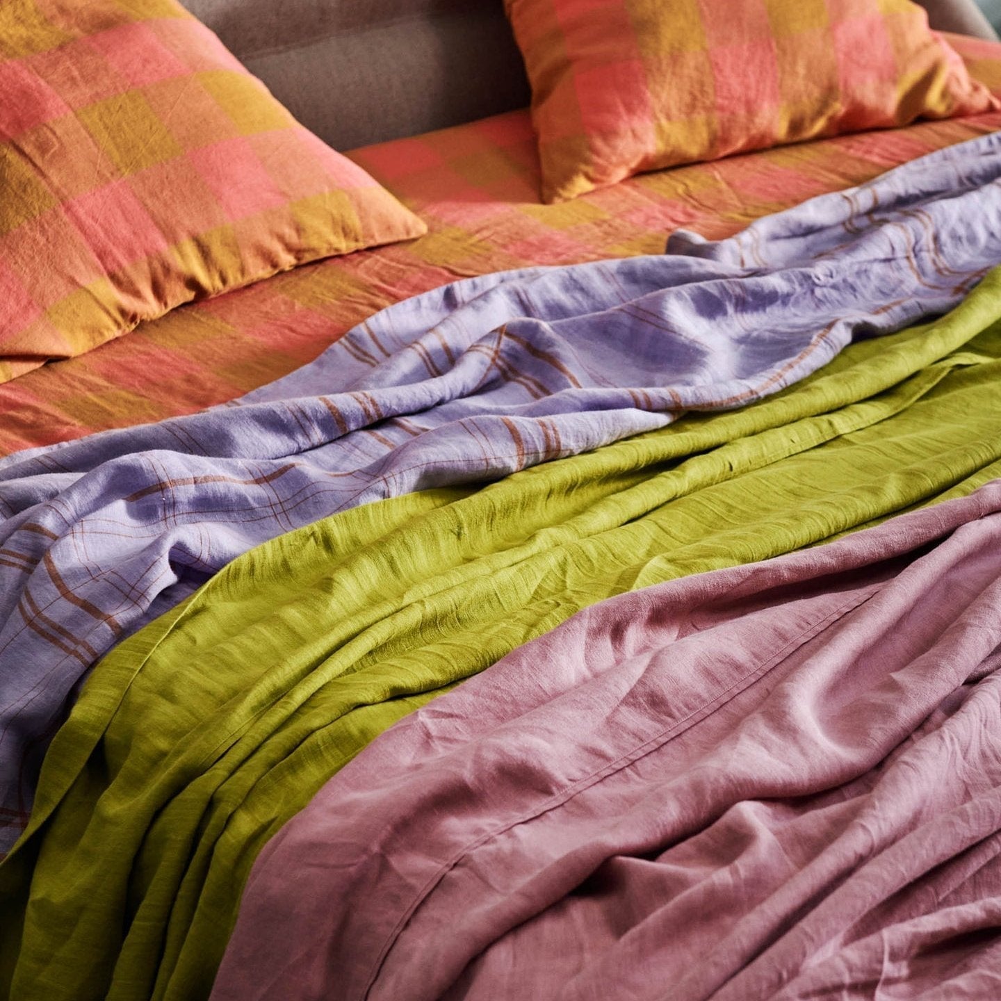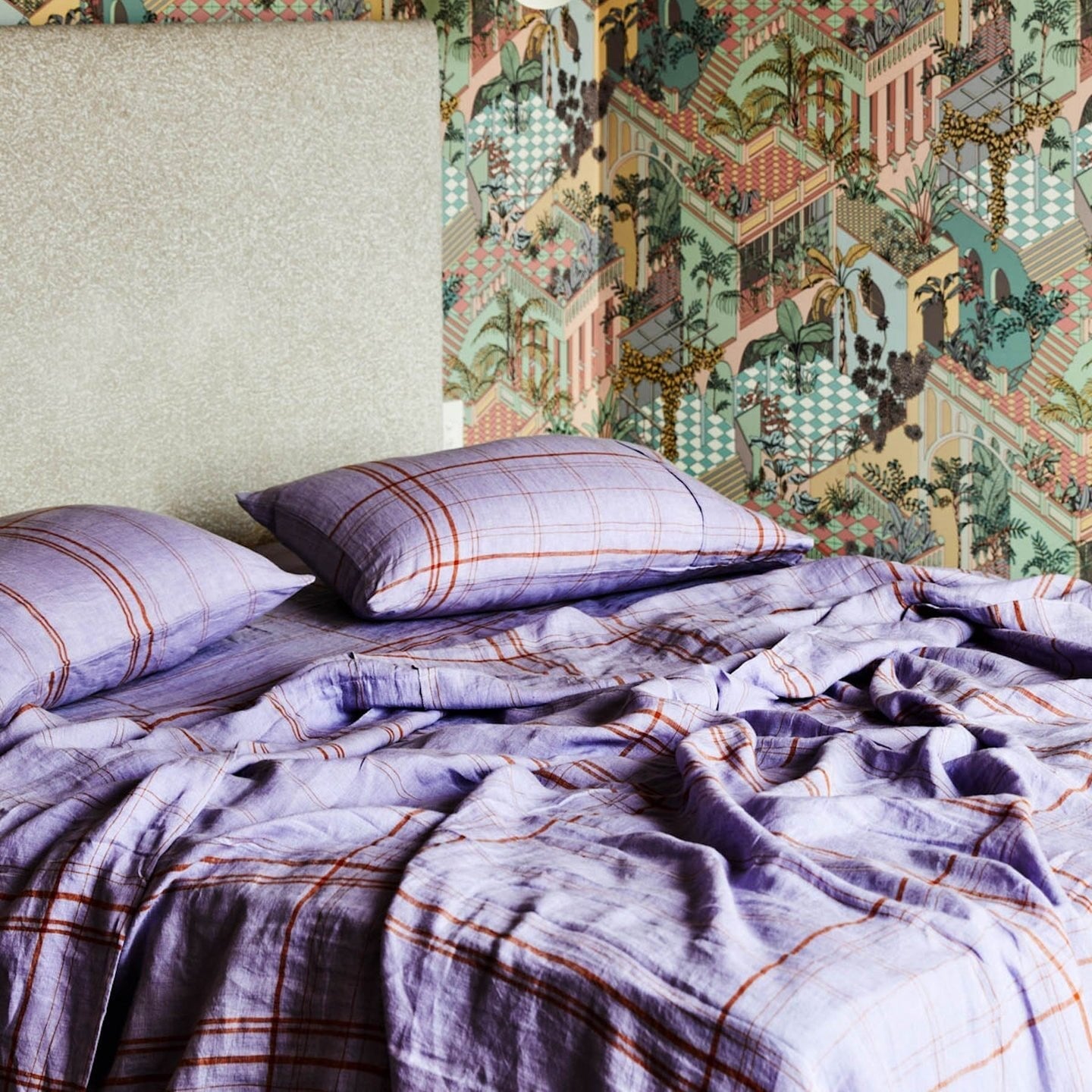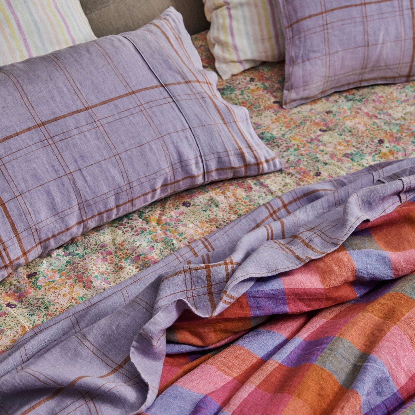 The Santa Monica Linen Flat Sheet is a simple woven tartan of lilac purple and a burgundy stripe. Layer your bed with luscious linen goodness. Our linen is made from 100% French flax, woven with care and wonderfully soft. Melt into your sweetest slumber.