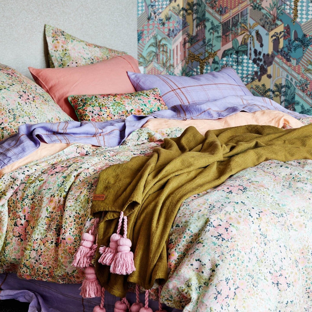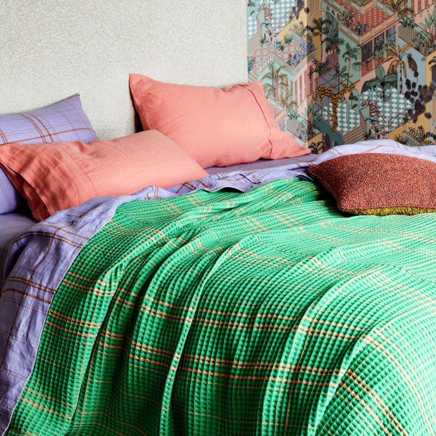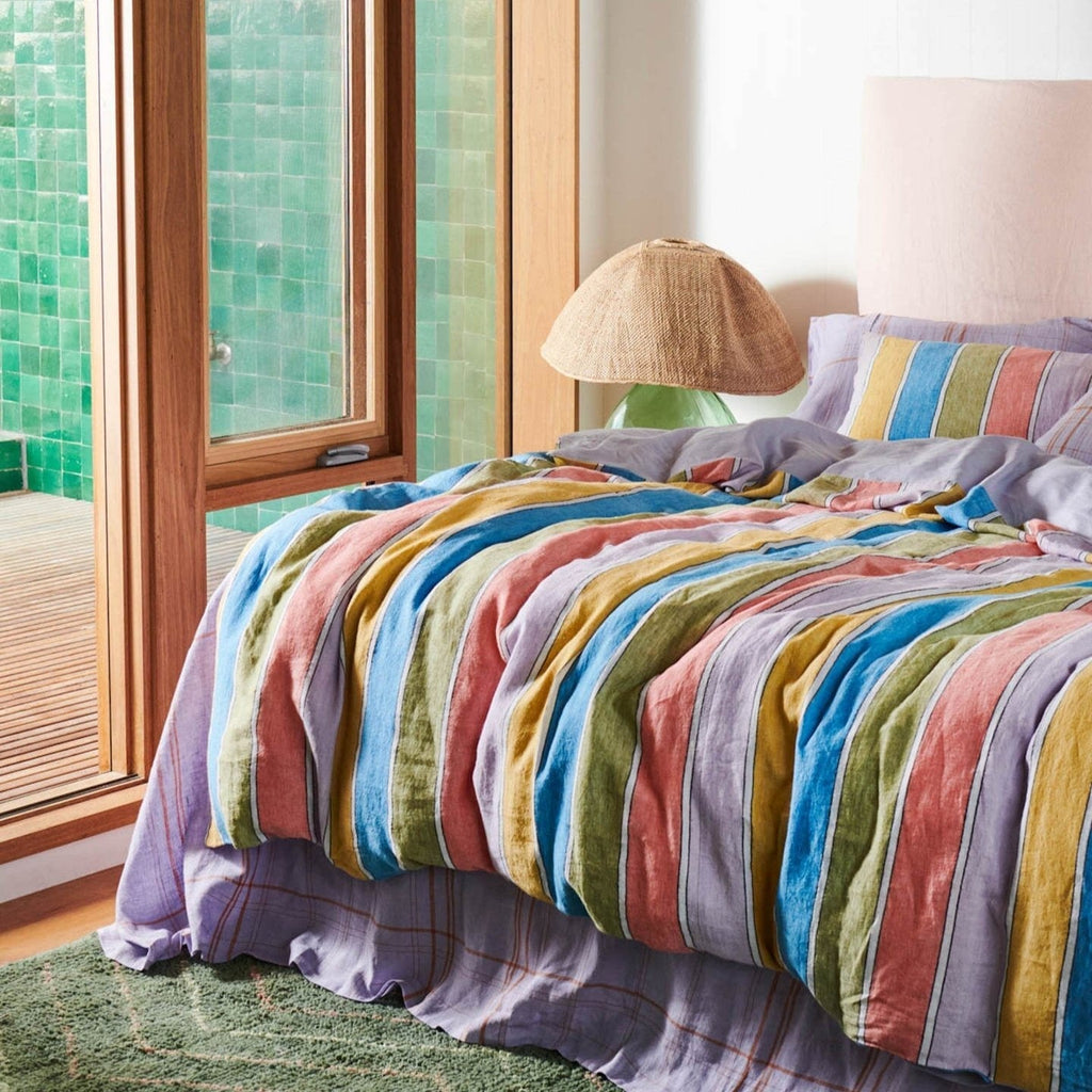 The Santa Monica Linen Flat Sheet is a simple woven tartan of lilac purple and a burgundy stripe. Layer your bed with luscious linen goodness. Our linen is made from 100% French flax, woven with care and wonderfully soft. Melt into your sweetest slumber.