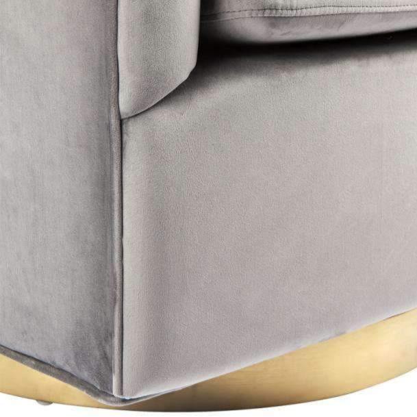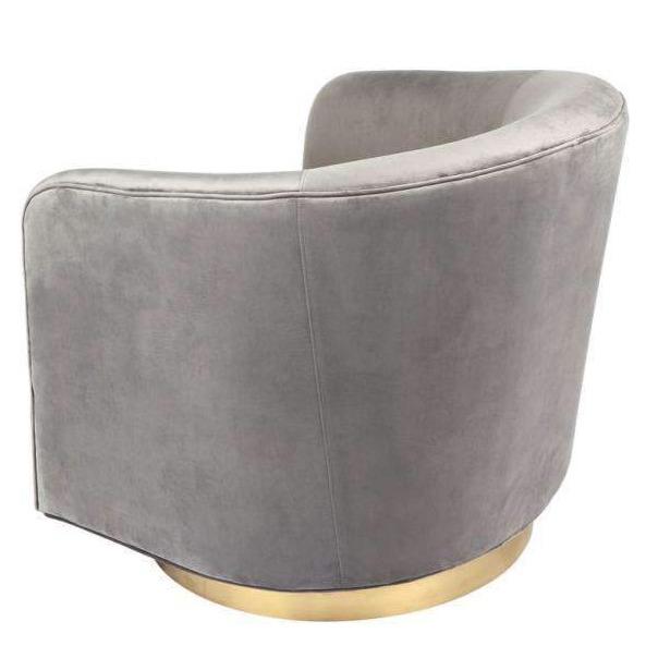 Charcoal velvet upholstered arm chair with detailed piping and a swivel base in antique brass finish