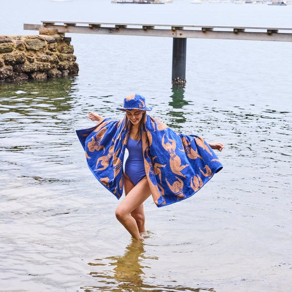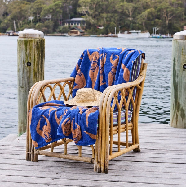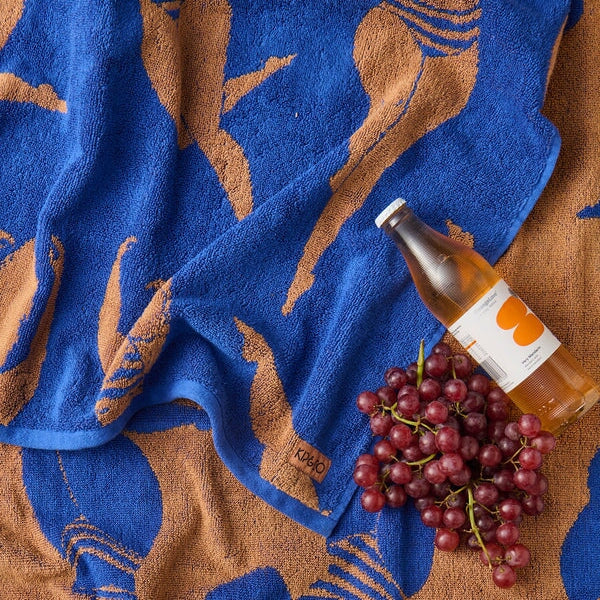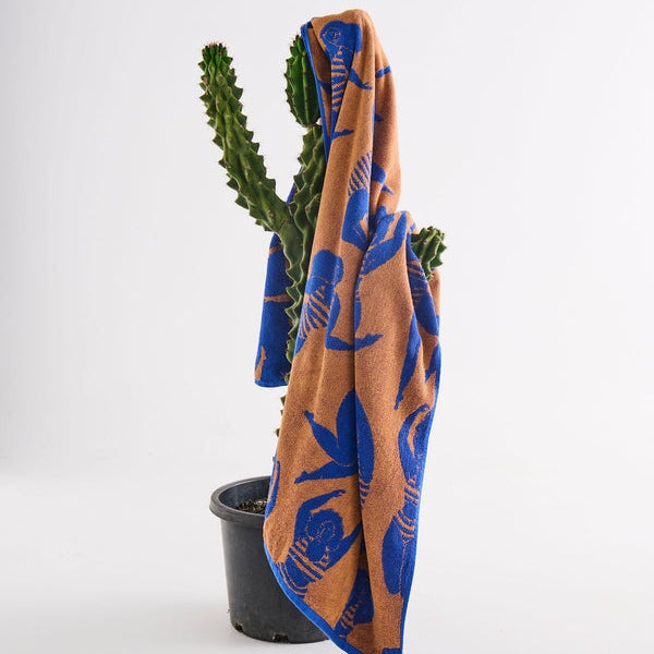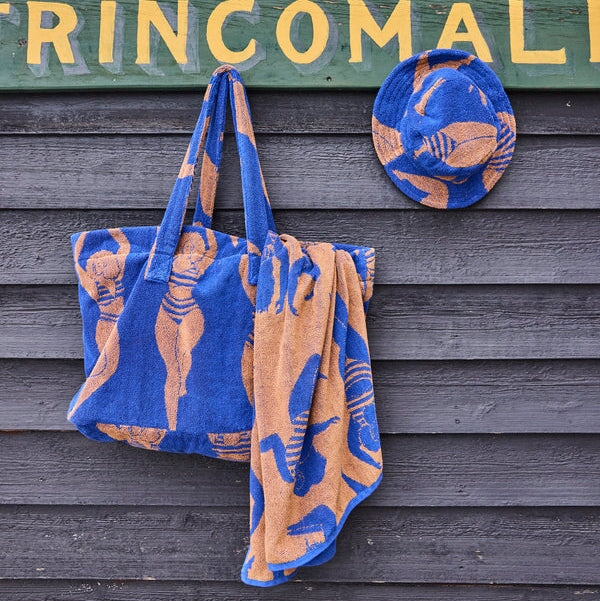 Soak up the sun, salt and some serious leisure time with our plush Sun Kissed Terry Beach Towel, your ultimate sidekick for a summer spent chasing waves and stretching out seaside. Soft, absorbent and super sized for full-body lounging, it’s made for sandy toes, salty skin and long, lazy beach days. Whether you're drying off post-dip or claiming your patch of paradise, this towel brings the sunshine vibes wherever it goes. Made from 100% cotton terry featuring golden goddess beach babes on a rich blue terry base.