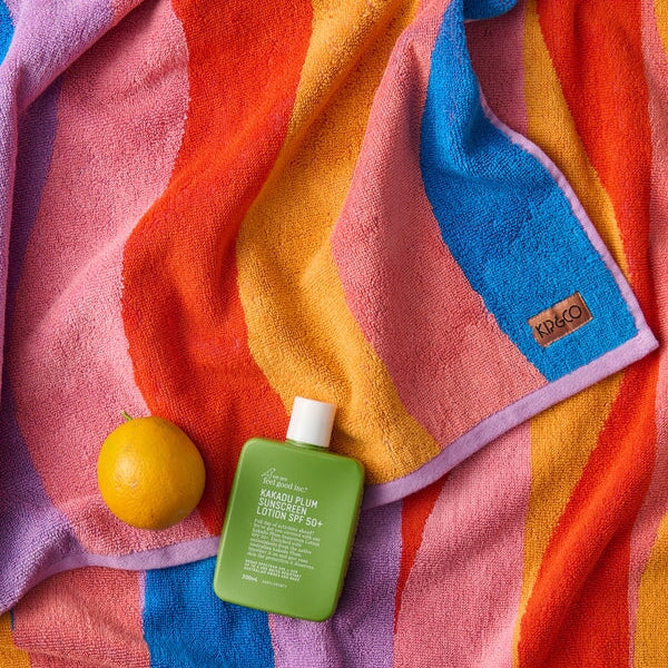 Soak up the sun, salt and some serious leisure time with our plush Surfs Up Terry Beach Towel, your ultimate sidekick for a summer spent chasing waves and stretching out seaside. Soft, absorbent and super sized for full-body lounging, it’s made for sandy toes, salty skin and long, lazy beach days. Whether you're drying off post-dip or claiming your patch of paradise, this towel brings the sunshine vibes wherever it goes. Made from 100% cotton terry featuring a curvy wave pattern of red, golden yellow, melon pink and blue with lilac purple woven edge finish.