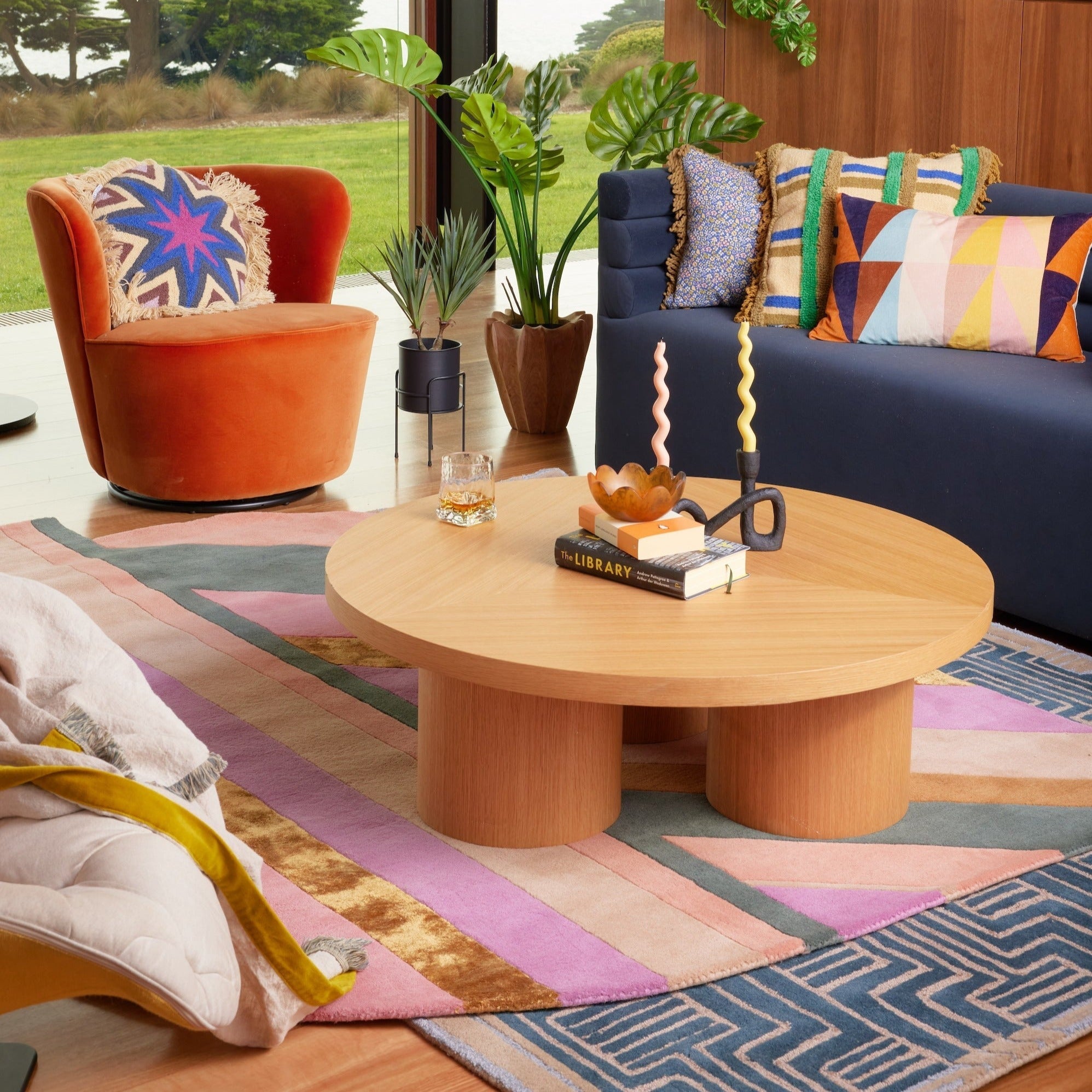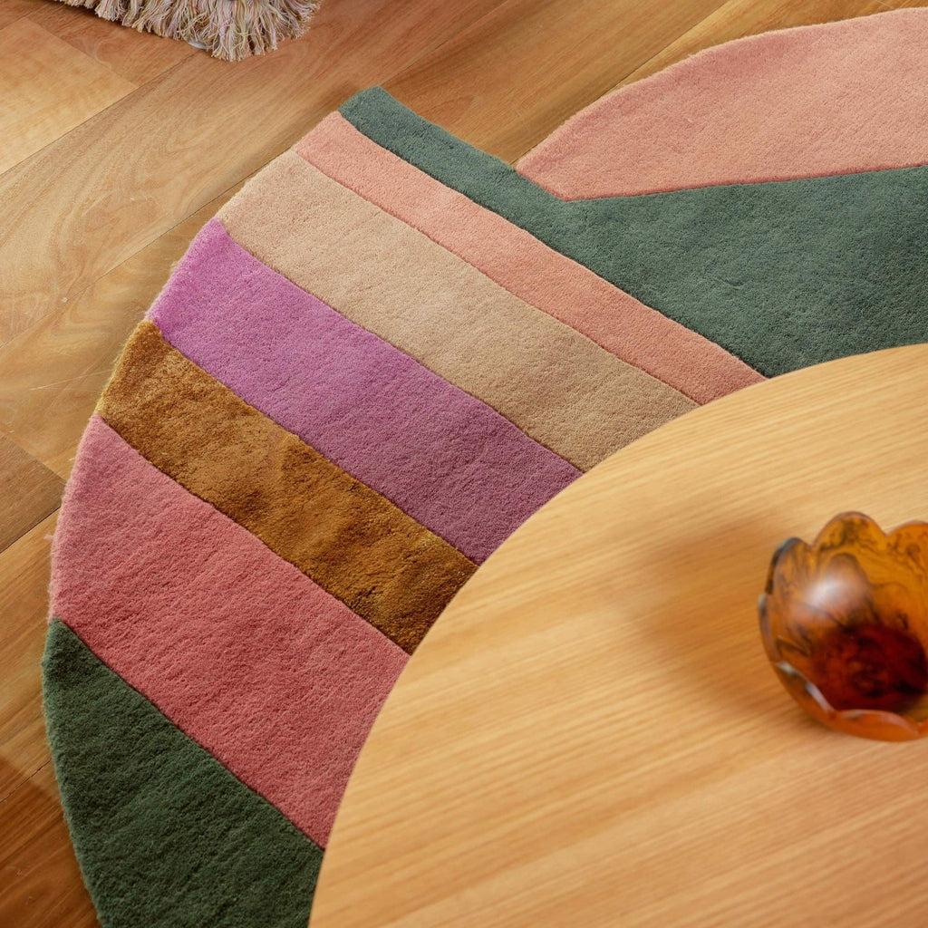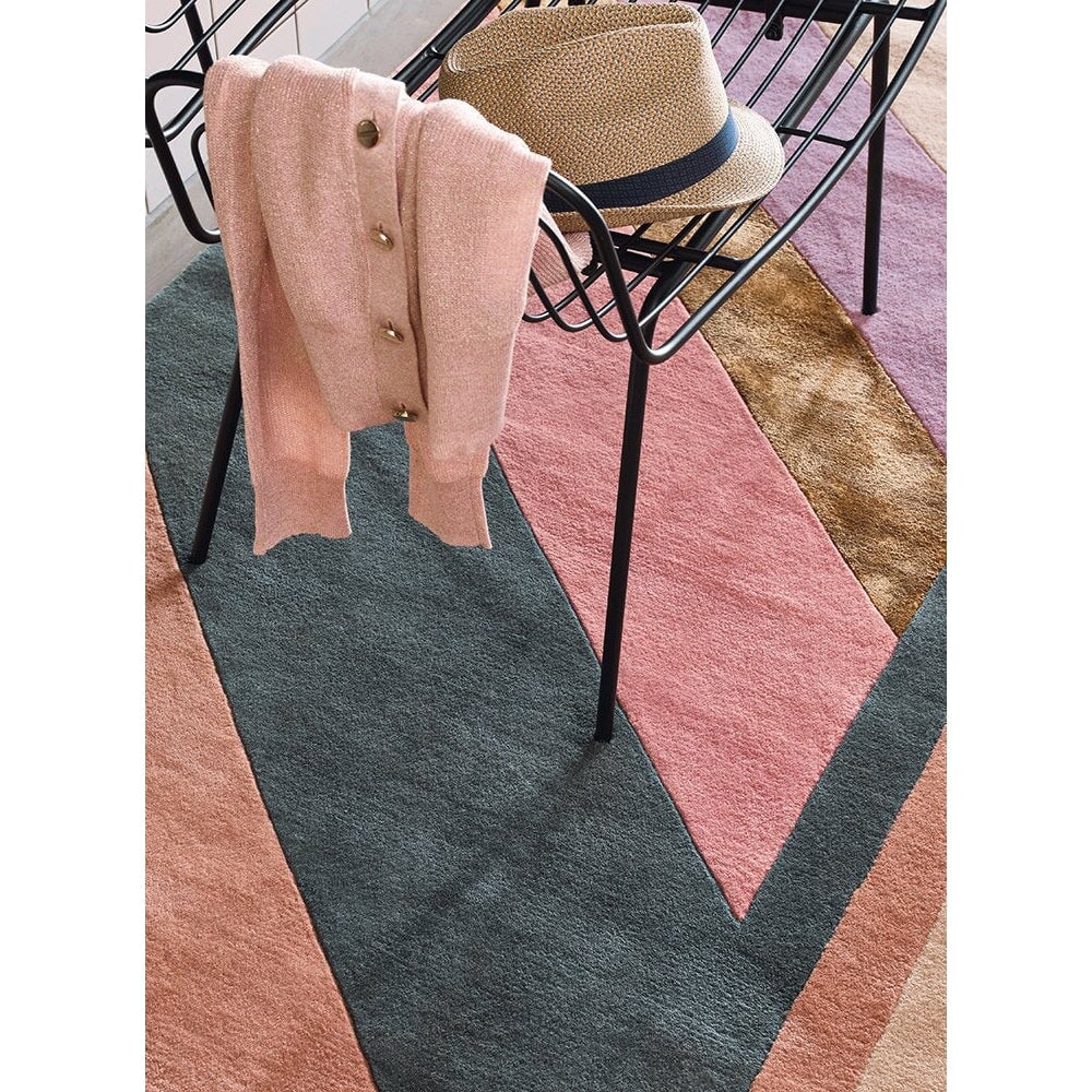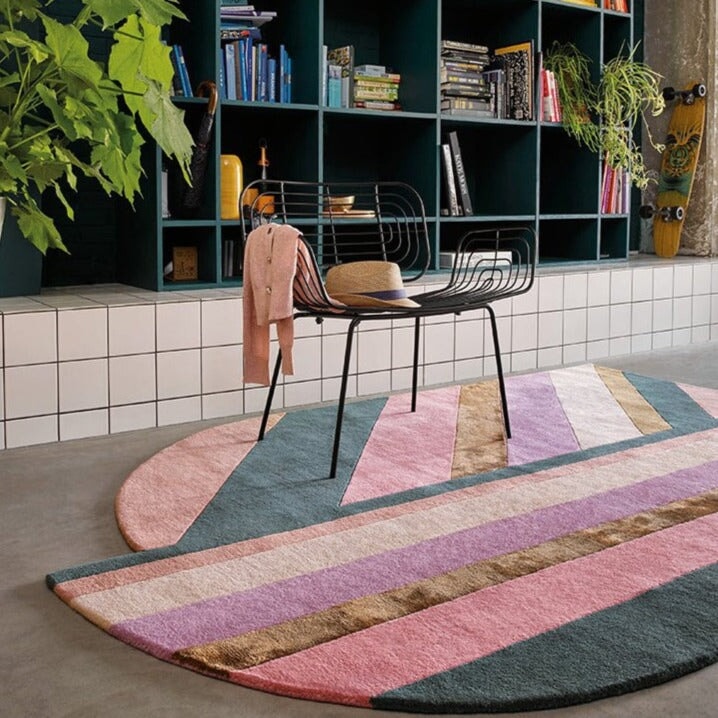 An asymmetric take on the bestselling Sahara Rug, Jardin is the latest standout Ted Baker design with retro feel. The bold stripes have a metallic gold streak running through the pink and teal hues. Made from luxurious viscose and wool, this rug has a soft, thick 12mm cut pile with a lustrous finish.