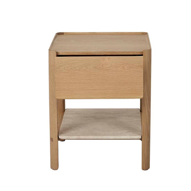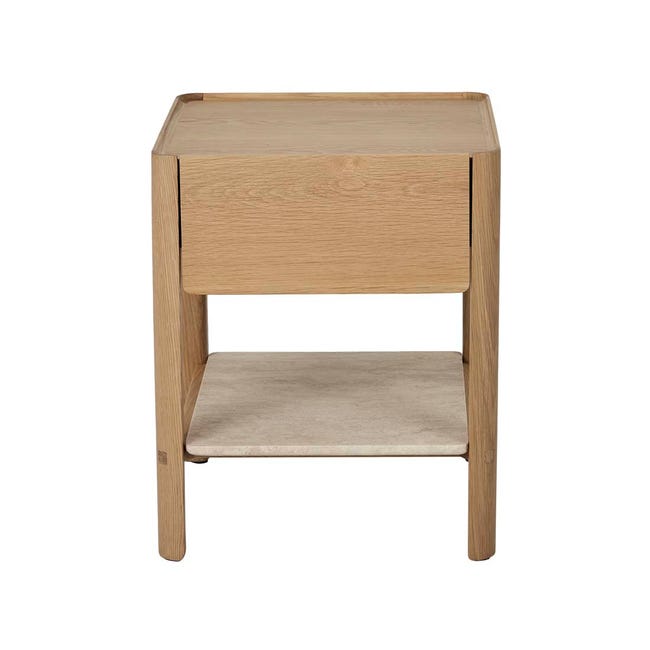 Crafted with a solid oak frame the Tolv Tye Bedside draws on simplified mid-century modern designs for a bold look in a bedroom. Its sleek style is enhanced with marble for an elevated touch, while a functional shelf and drawer give convenient storage.