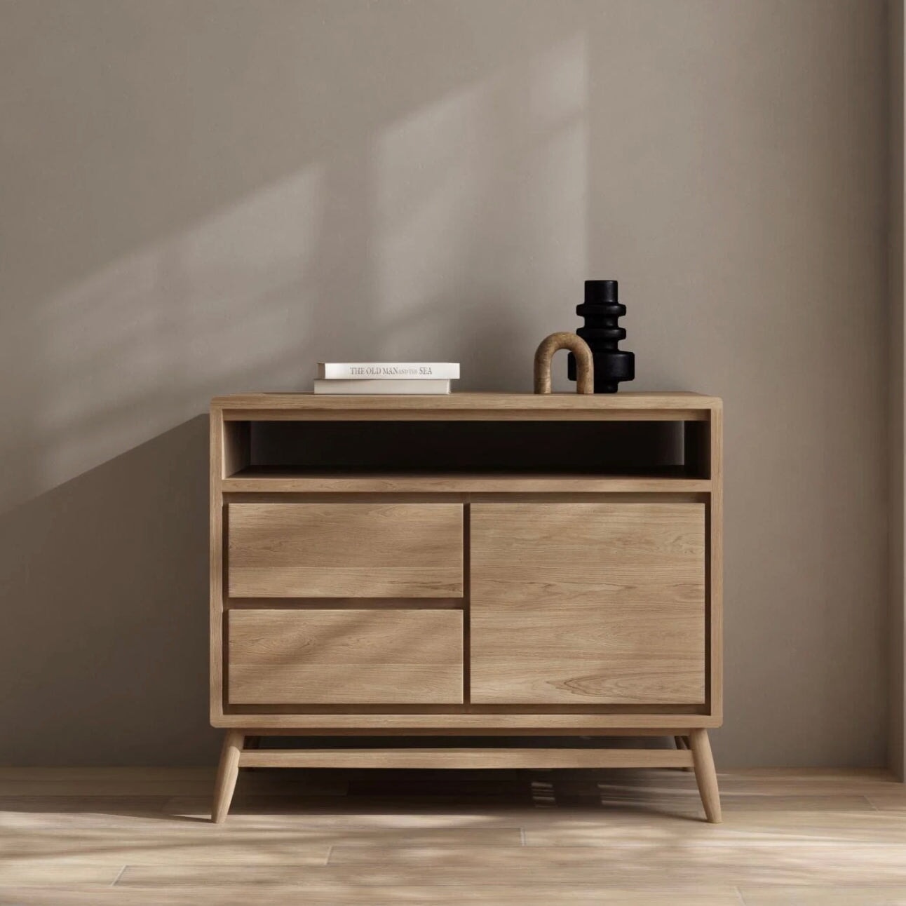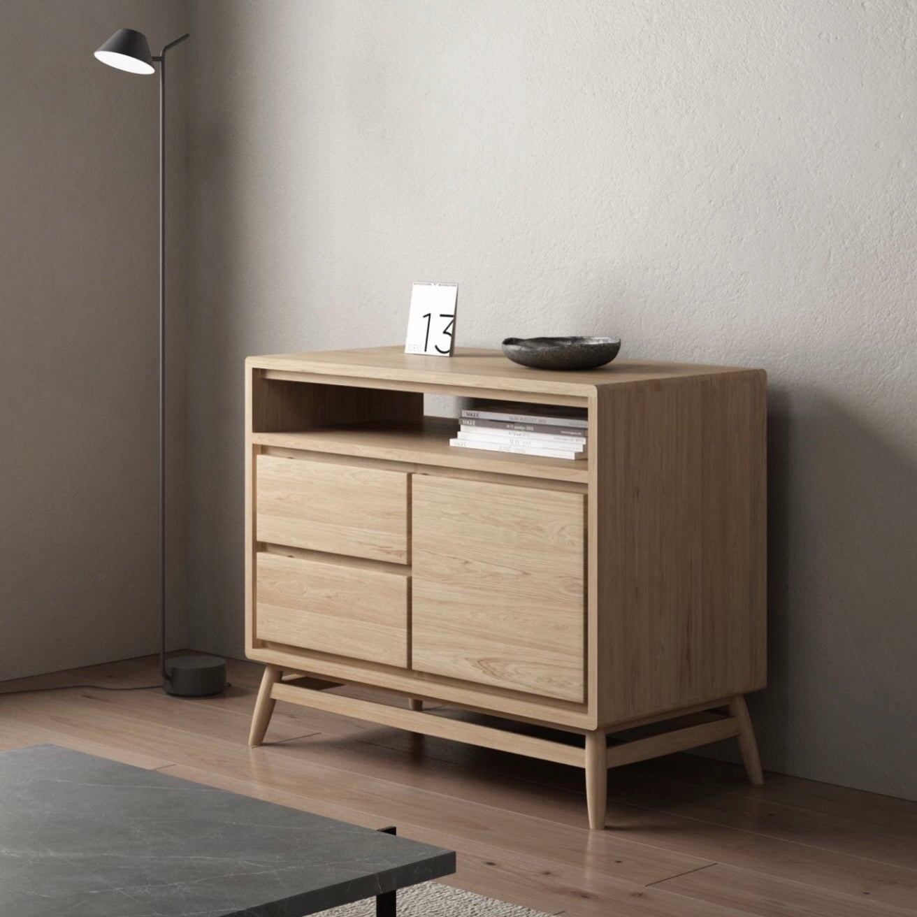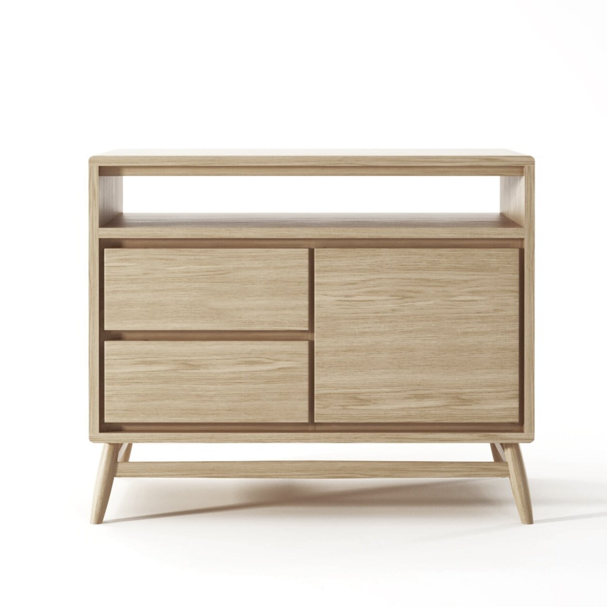 Stunning Sideboard with soft close door and drawers in European White Oak. This Twist Sideboard has 1 door & 2 drawers. Classic retro design with a contemporary TWIST. This range encompasses simple, clean, rounded lines and a complementary balance of modern aesthetics, functionality and sheer underrated class. Classic Danish inspired design. Place it with pride in any room that requires an elegant lady.