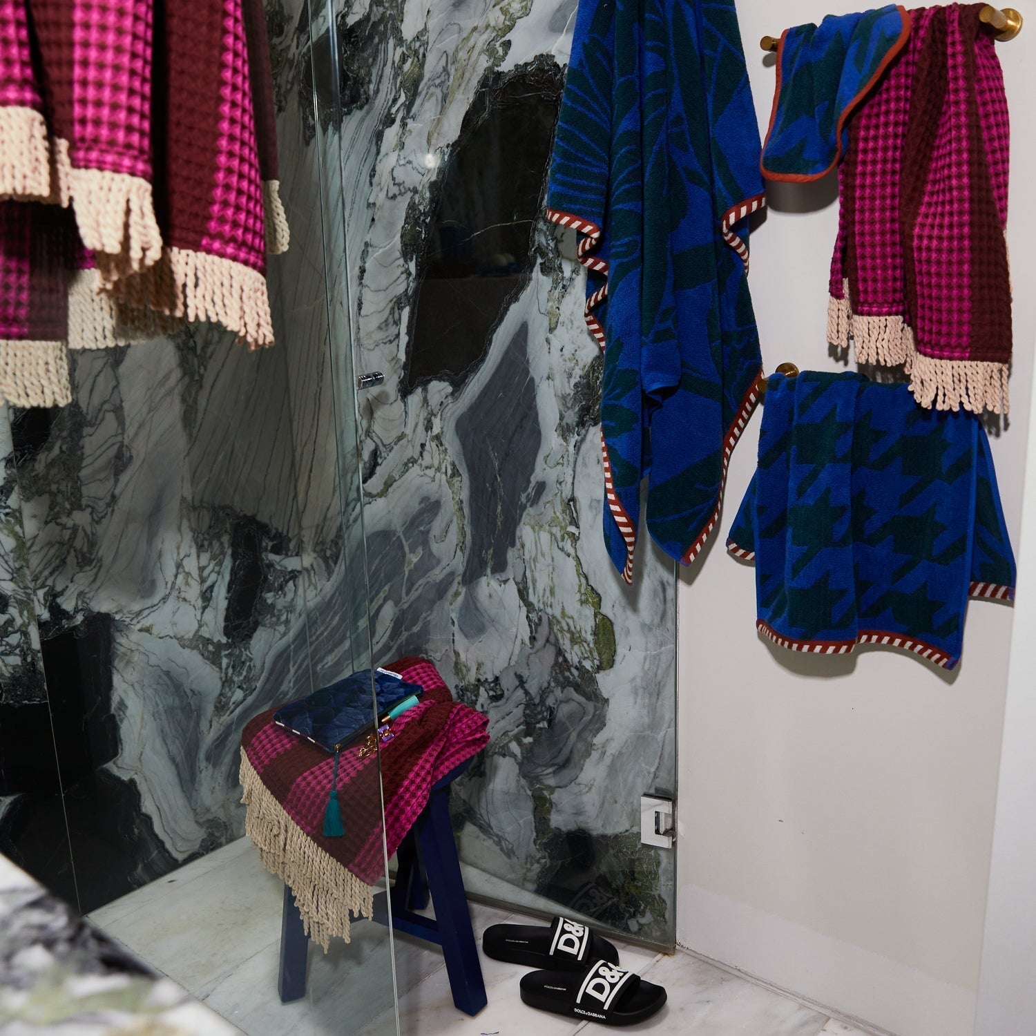 “Reimagining a timeless houndstooth pattern in unexpected colour combinations, our sophisticated Vinita towels add a touch of super-soft luxury to your daily routine. Striped edging tops off the look to bring a little playfulness to your bathroom.” – Phoebe’s Style Notes