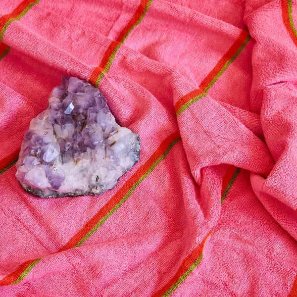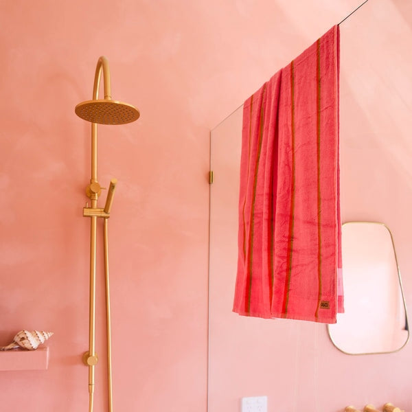 Elevate your daily ritual with our new Wategos Soiree Stripe Bamboo Terry Bath Towel. In a bold melon pink with rich red and mustard stripes, it’s a vibrant nod to seaside summers, now reimagined for your bathroom. Crafted from a luxuriously soft bamboo and cotton blend, it’s beautifully plush, absorbent, and designed to feel like a five-star spa with every use. Fresh towels, fresh mood.